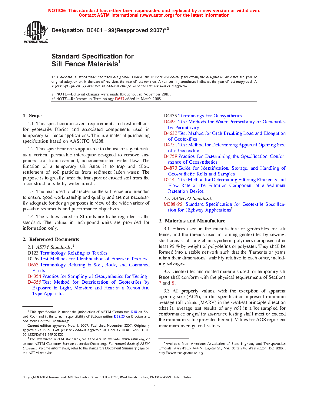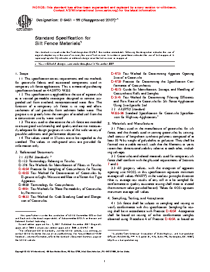 1.1 This specification covers requirements and test methods for geotextile fabrics and associated components used in temporary silt fence applications. This is a material purchasing specification based on AASHTO M288.