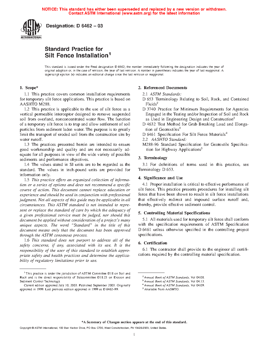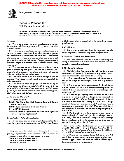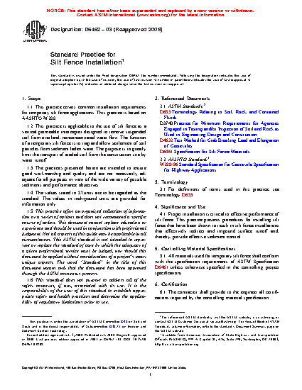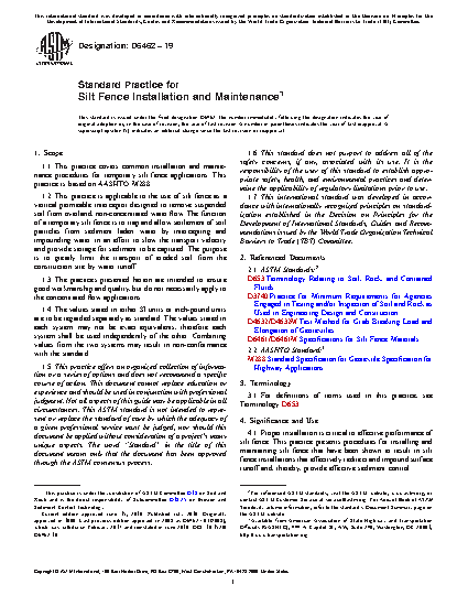 1.1 This practice covers common installation and maintenance procedures for temporary silt fence applications. This practice is based on AASHTO M288.