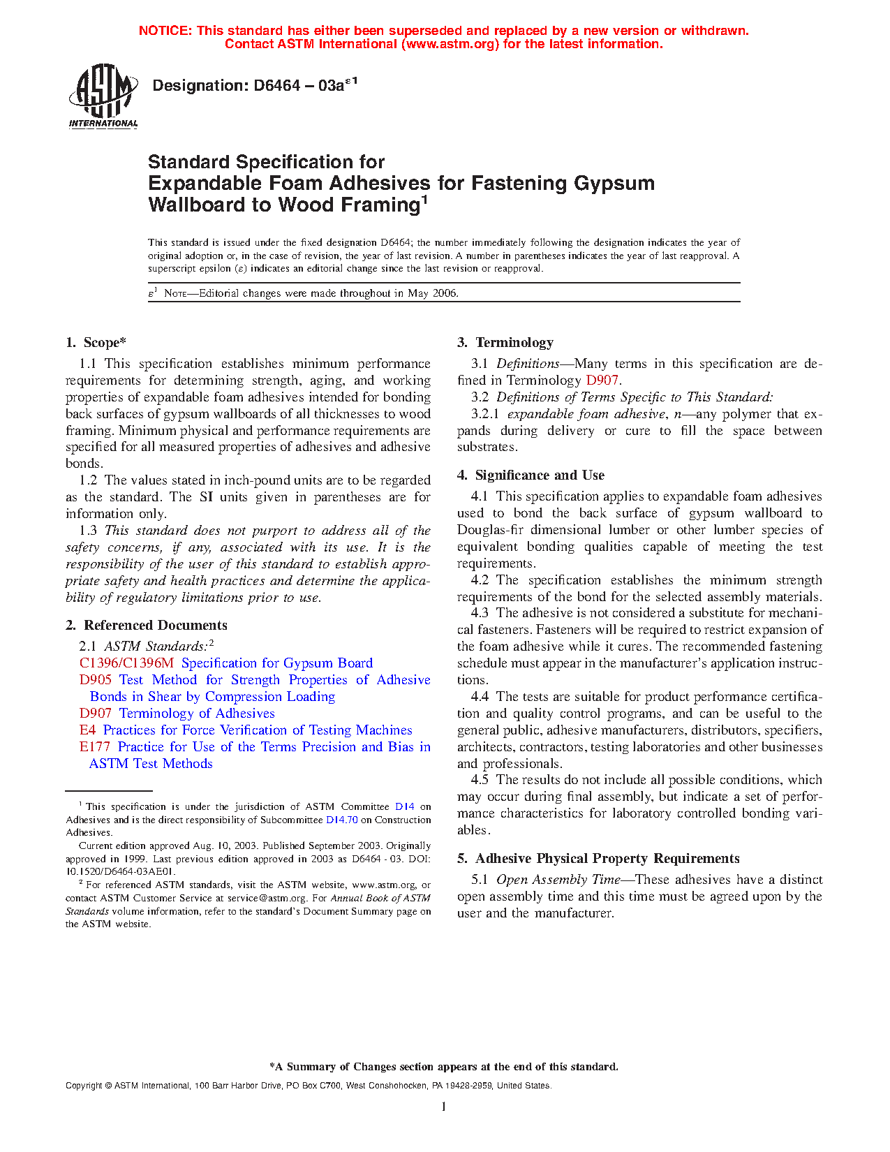 1.1 This specification establishes minimum performance requirements for determining strength, aging, and working properties of expandable foam adhesives intended for bonding back surfaces of gypsum wallboards of all thicknesses to wood framing. Minimum physical and performance requirements are specified for all measured properties of adhesives and adhesive bonds.