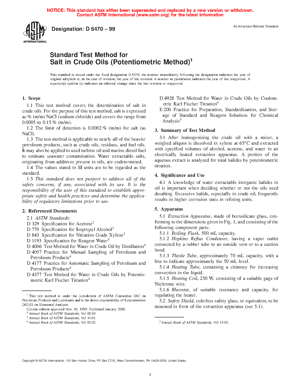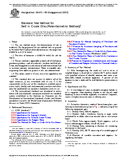 1.1 This test method covers the determination of salt in crude oils. For the purpose of this test method, salt is expressed as % (m/m) NaCl (sodium chloride) and covers the range from 0.0005 % to 0.15 % (m/m).