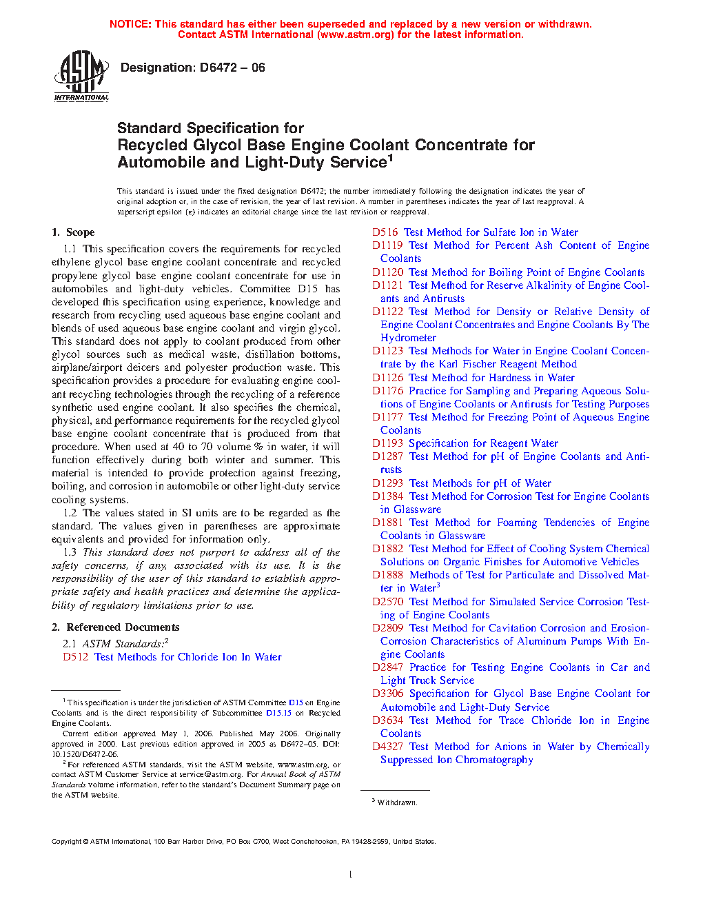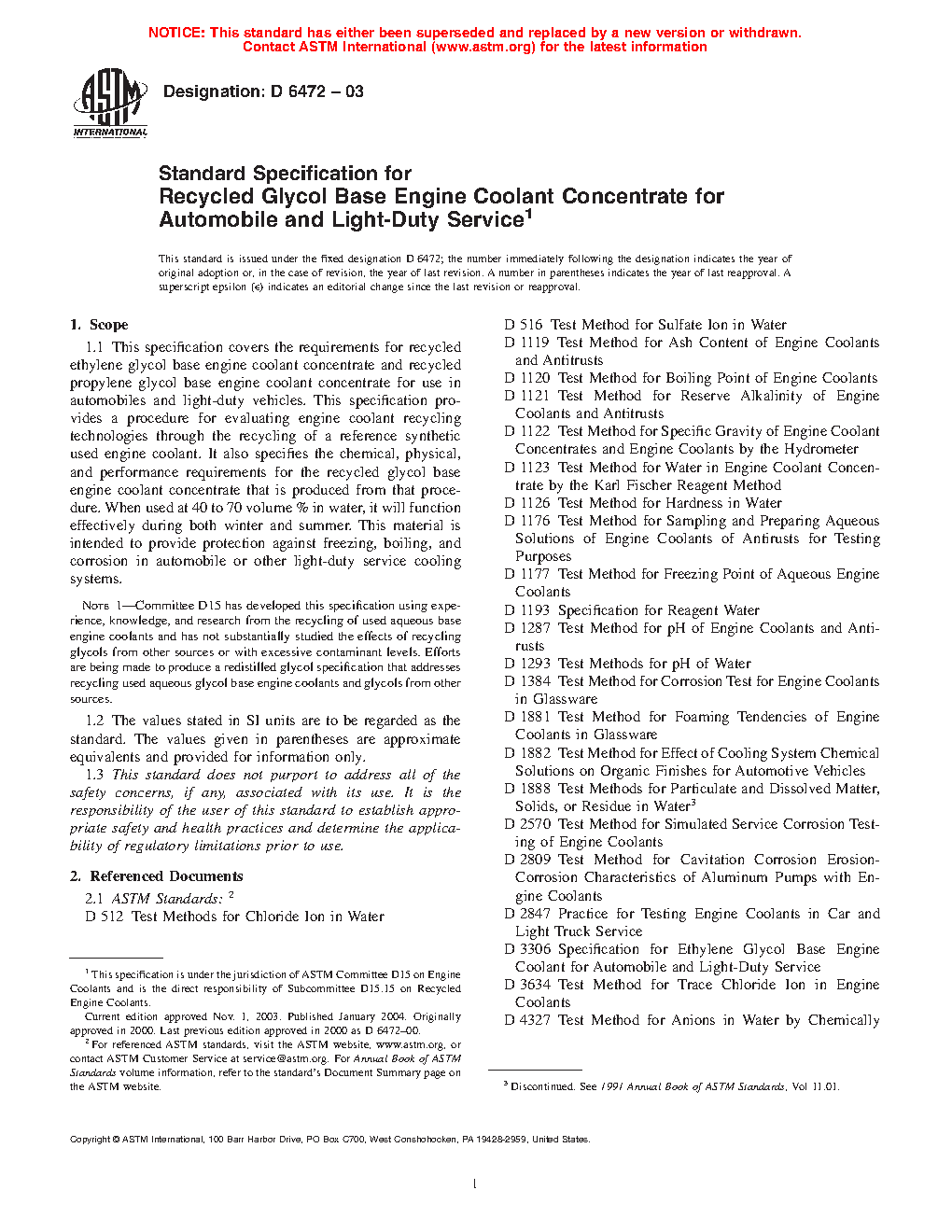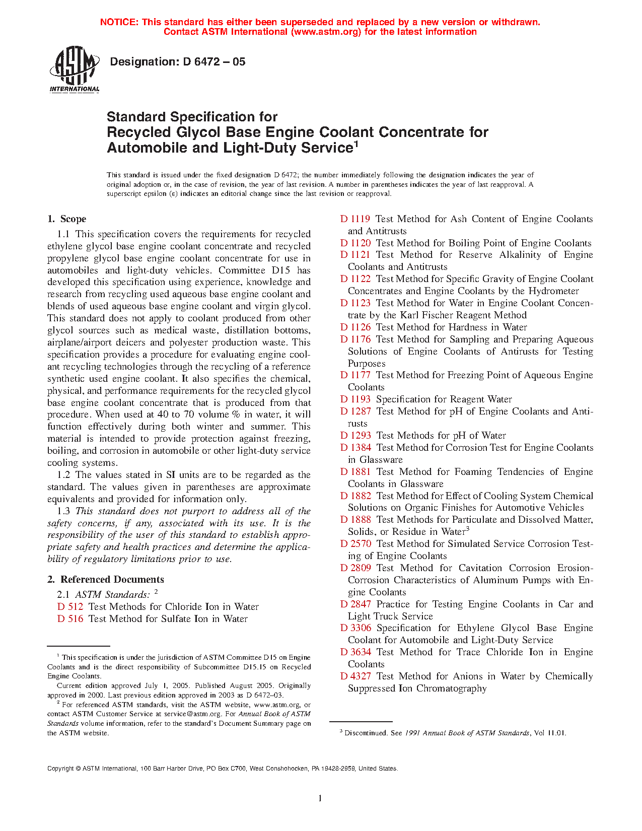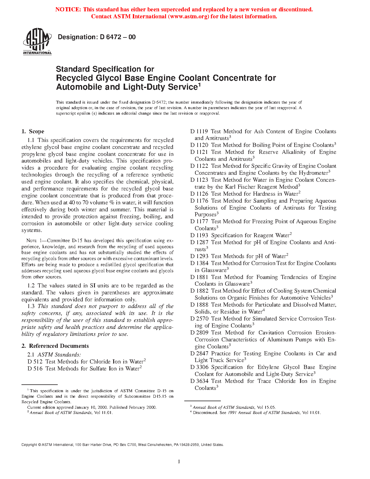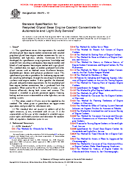 Note 1Committee D-15 has developed this specification using experience, knowledge, and research from the recycling of used aqueous base engine coolants and has not substantially studied the effects of recycling glycols from other sources or with excessive contaminant levels. Efforts are being made to produce a redistilled glycol specification that addresses recycling used aqueous glycol base engine coolants and glycols from other sources.