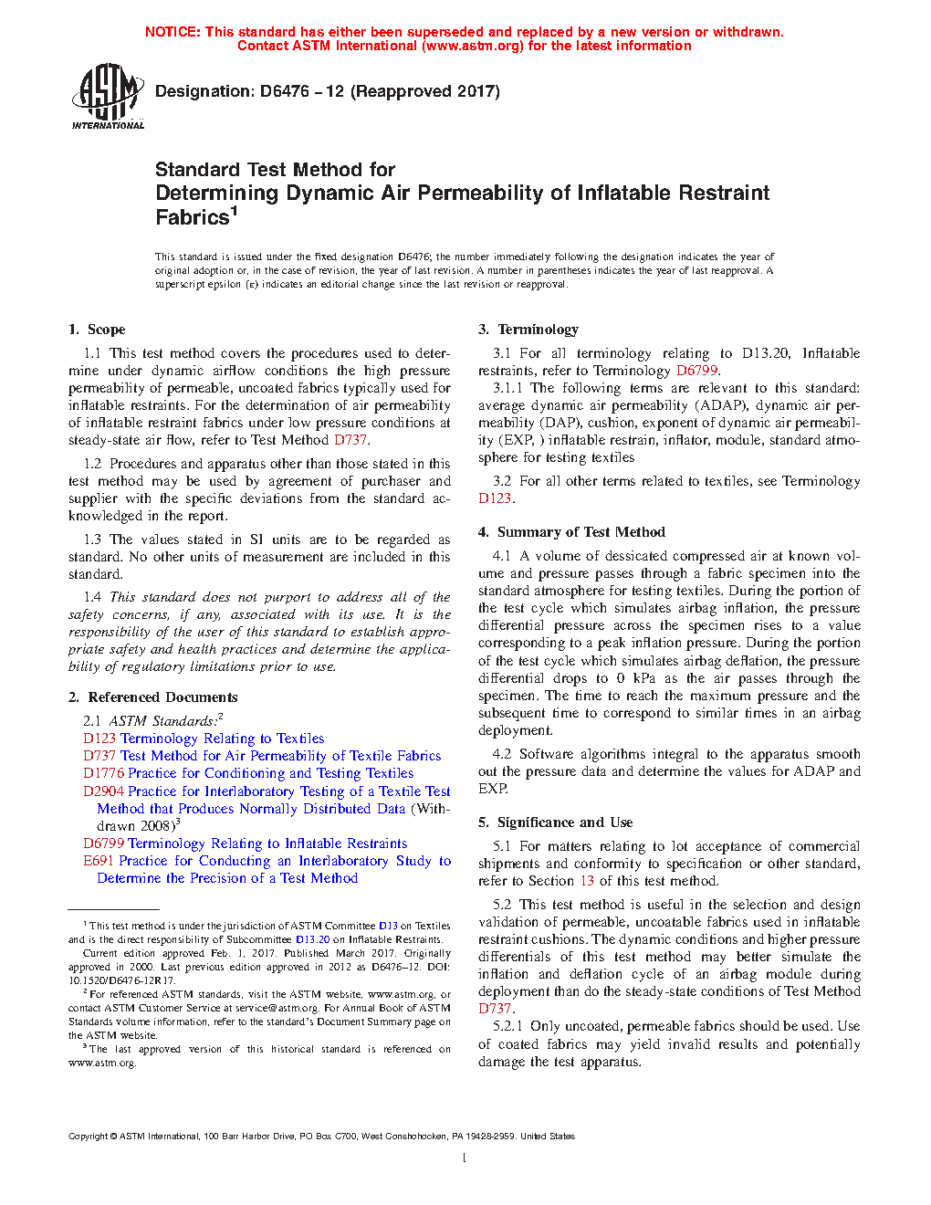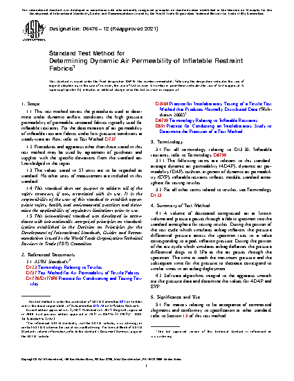 Standard Test Method for Determining Dynamic Air Permeability of Inflatable Restraint Fabrics