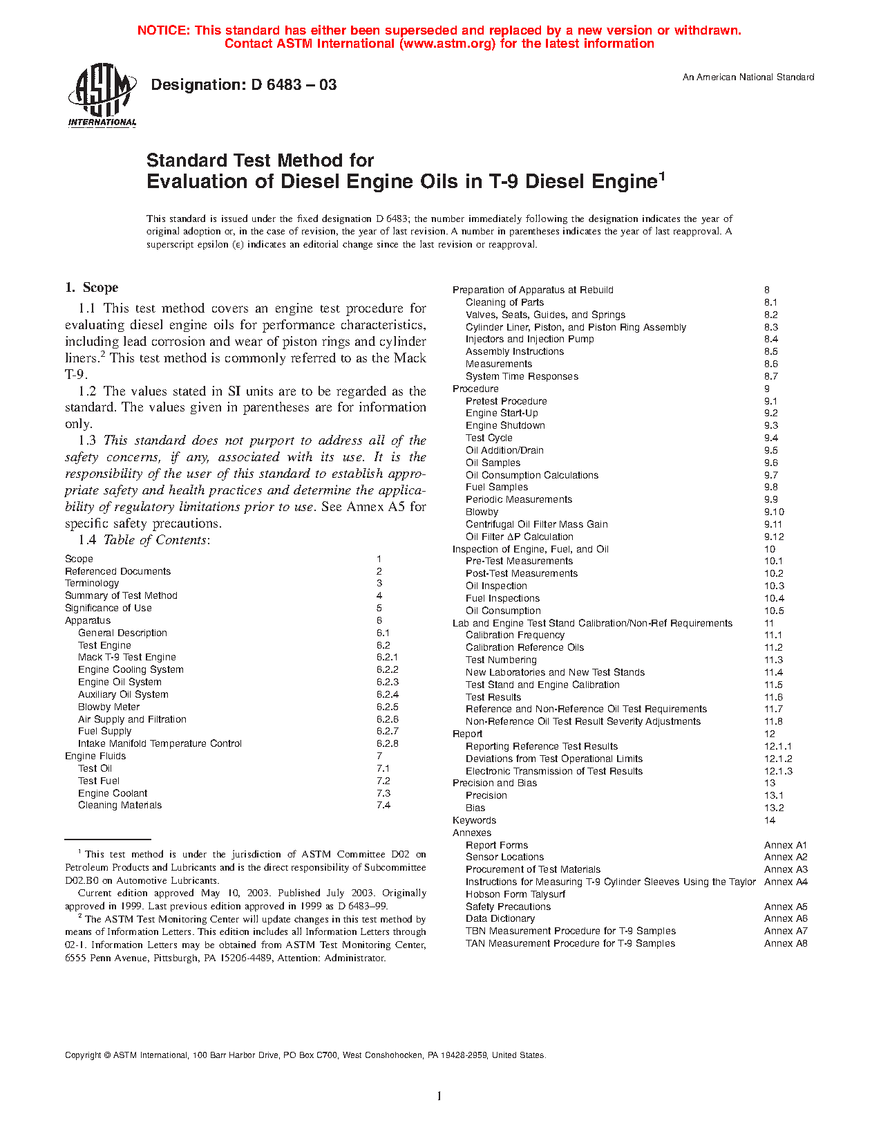 This test method was developed to evaluate the wear performance of engine oils in turbocharged and intercooled four-cycle diesel engines. Obtain results from used oil analysis and component measurements before and after test.