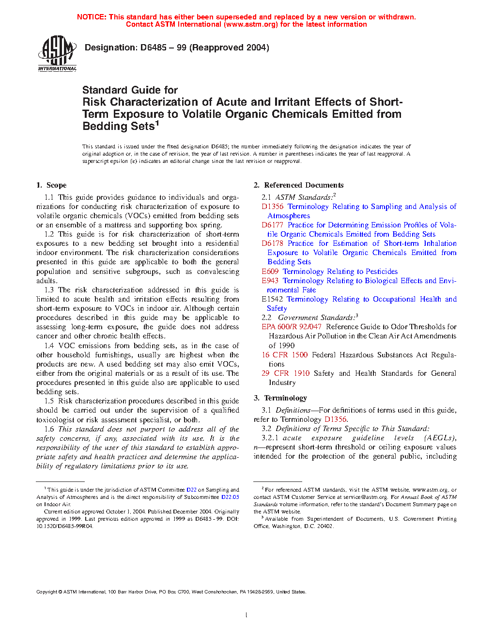 1.1 This guide describes procedures for conducting risk characterization of exposure to volatile organic chemicals (VOCs) emitted from bedding sets or an ensemble of a mattress and supporting box spring.
