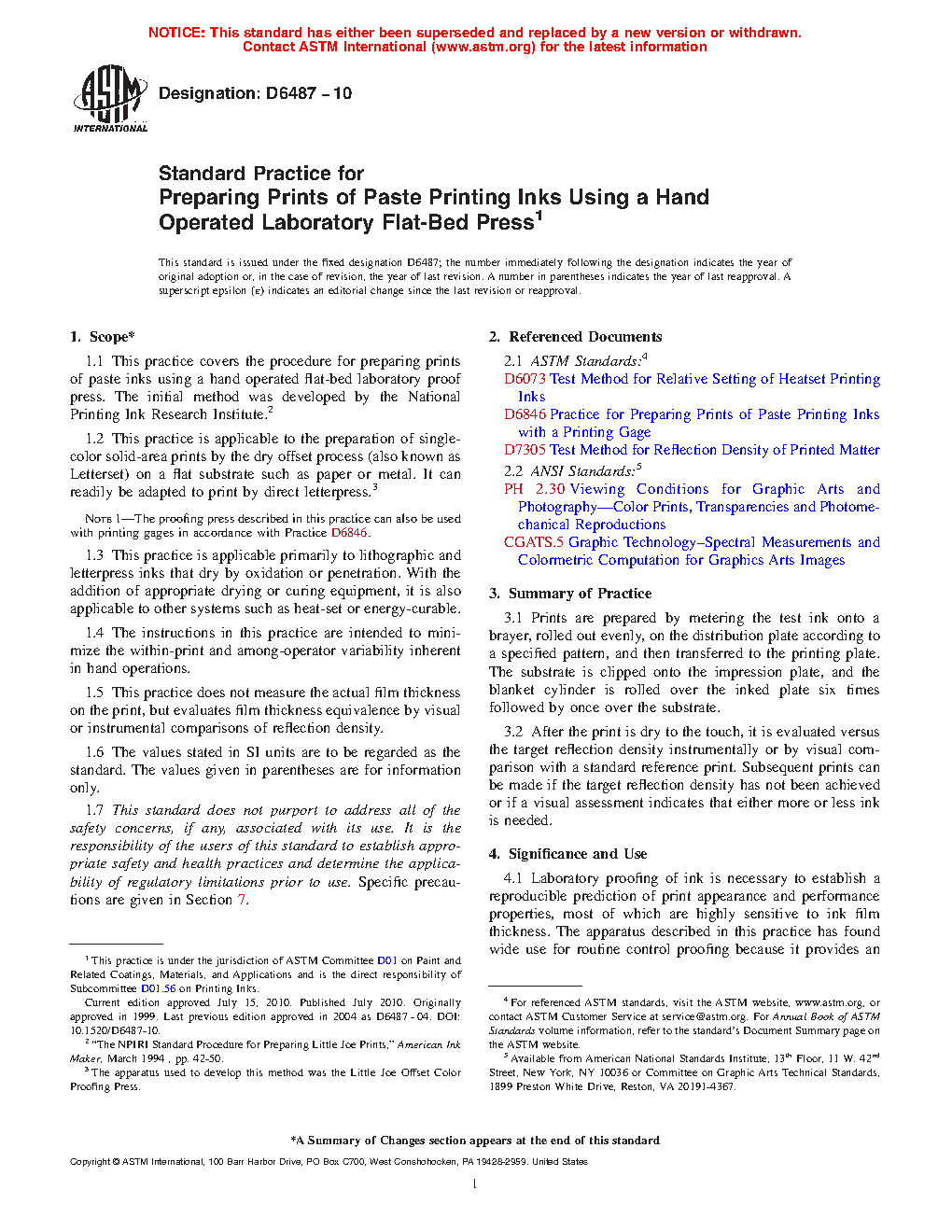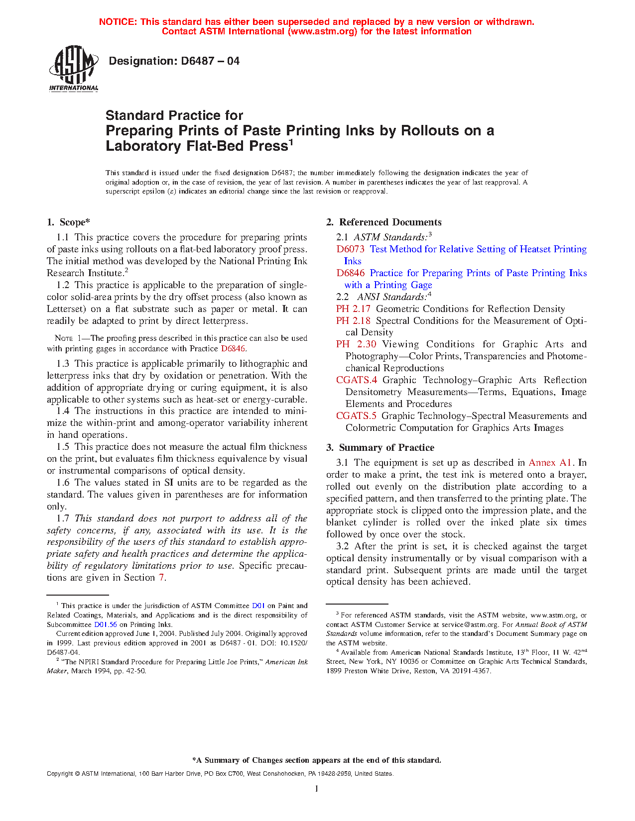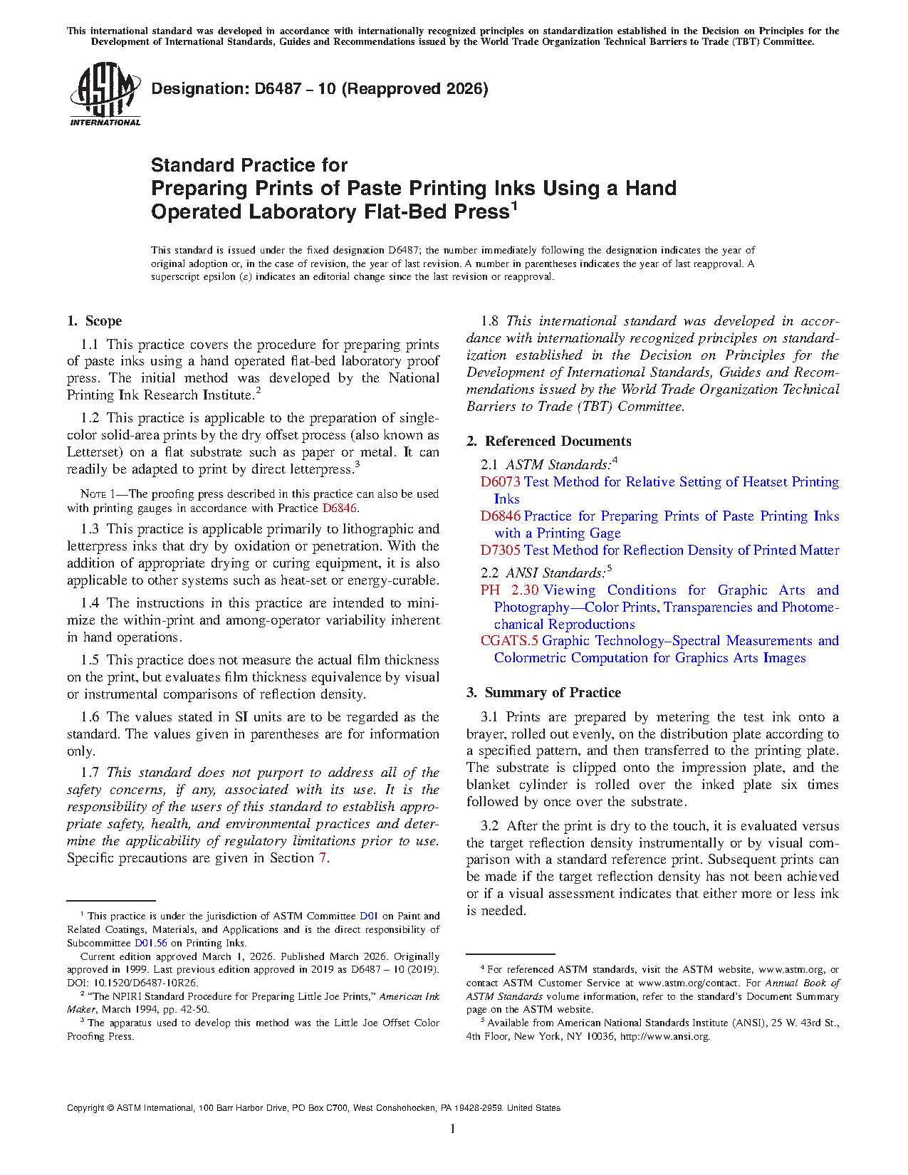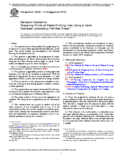 1.1 This practice covers the procedure for preparing prints of paste inks using a hand operated flat-bed laboratory proof press. The initial method was developed by the National Printing Ink Research Institute.