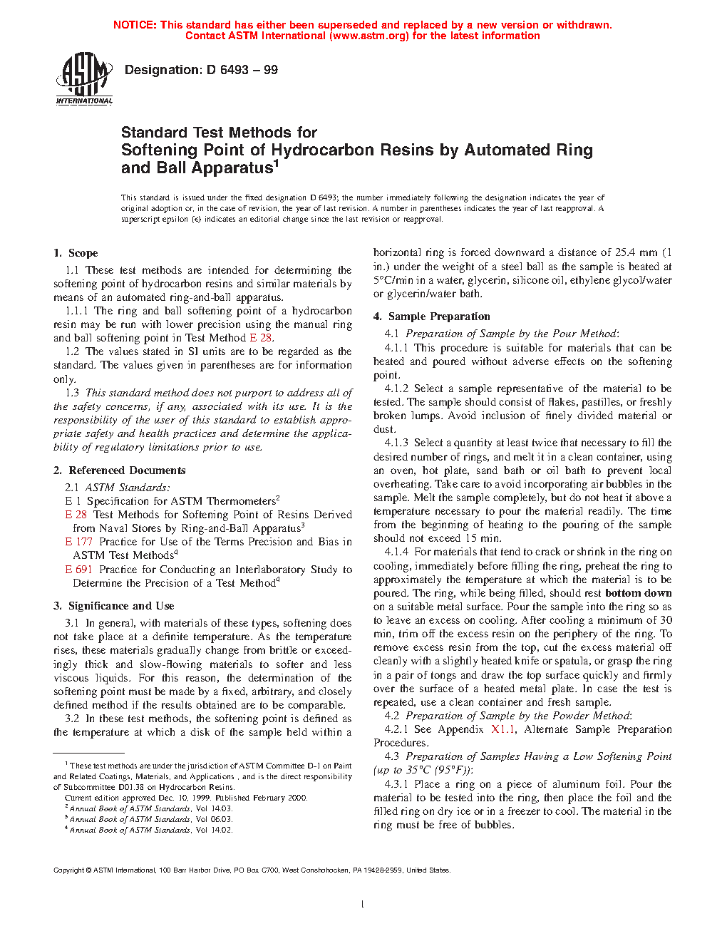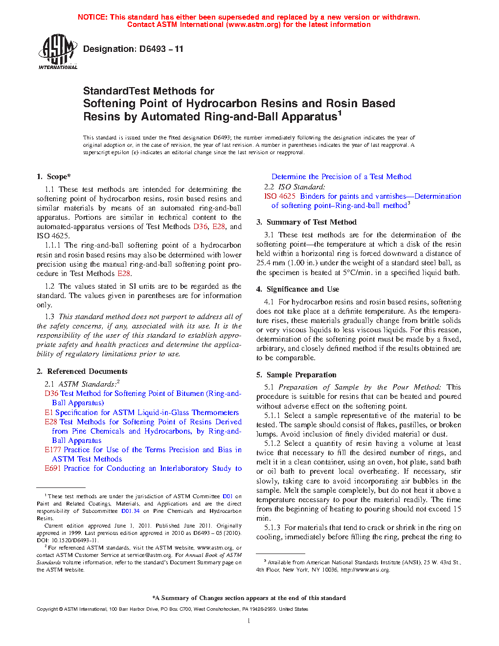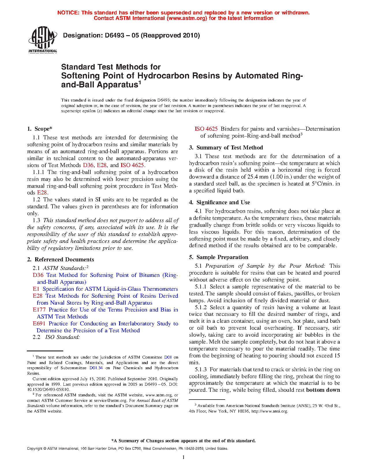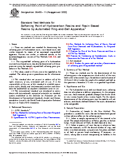 1.1 These test methods are intended for determining the softening point of hydrocarbon resins and similar materials by means of an automated ring-and-ball apparatus. Portions are similar in technical content to the automated-apparatus versions of Test Methods D 36, E 28, and ISO 4625.