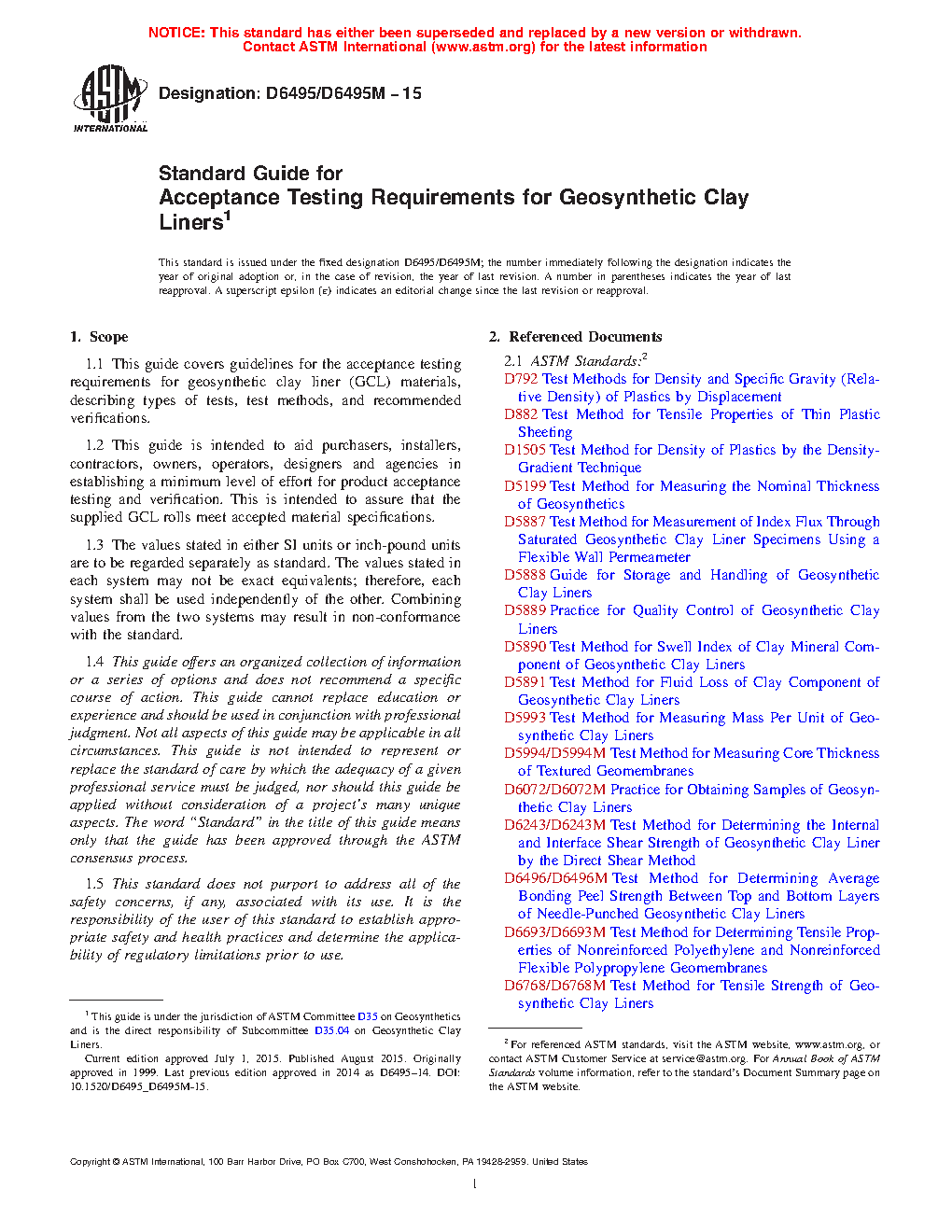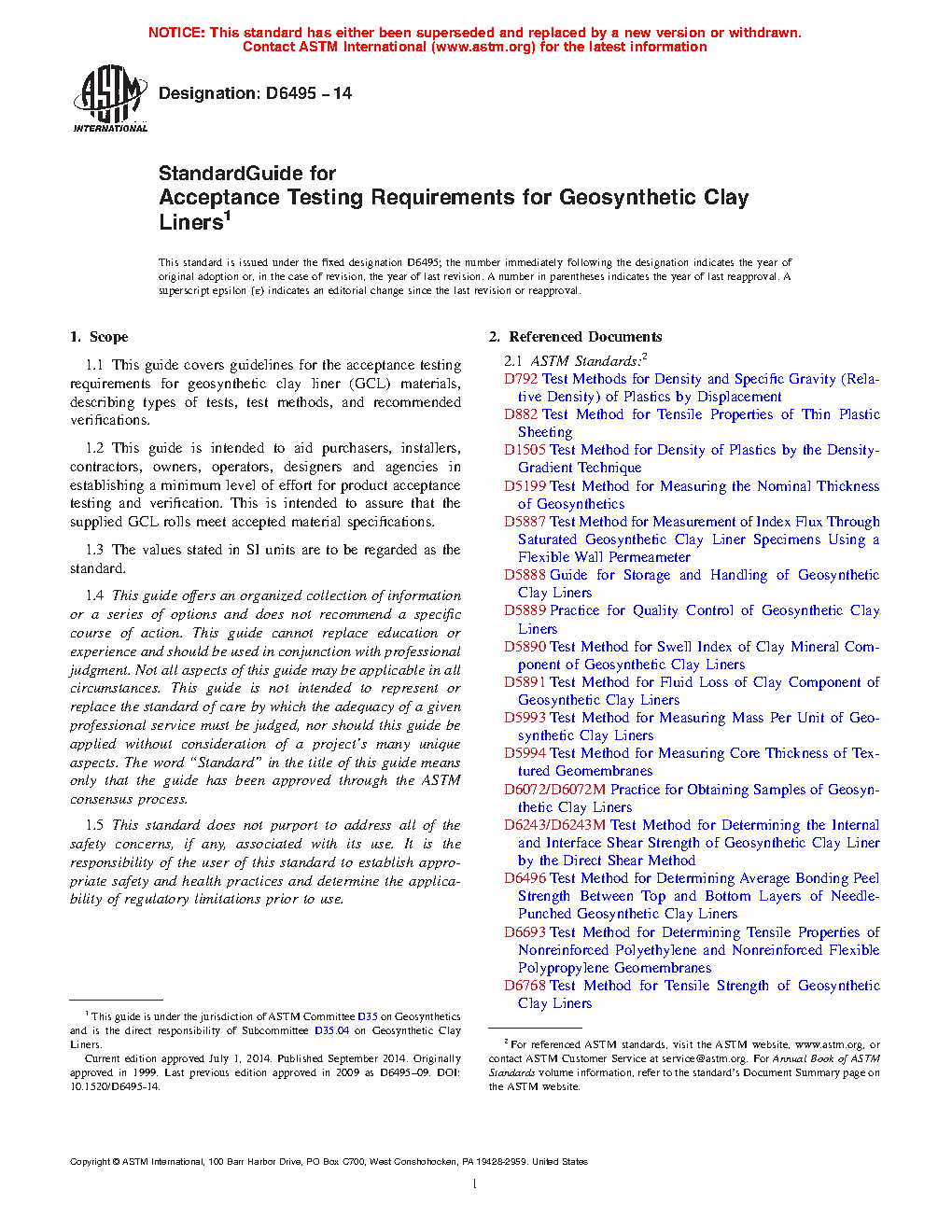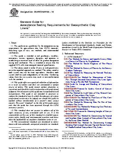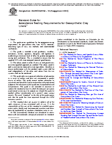 1.1 This guide covers guidelines for the acceptance testing requirements for geosynthetic clay liner (GCL) materials, describing types of tests, test methods, and recommended verifications.