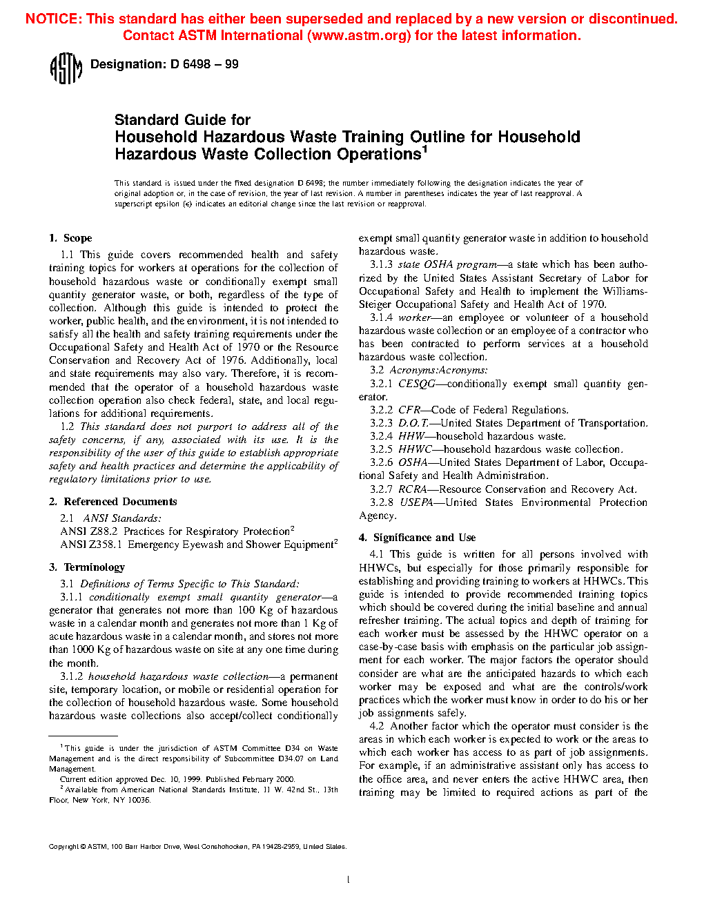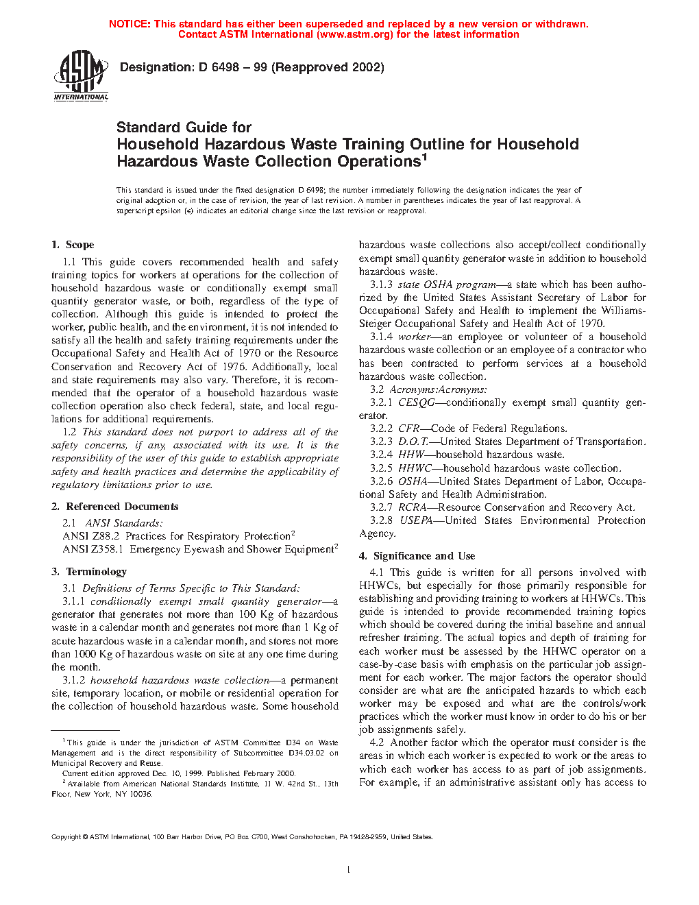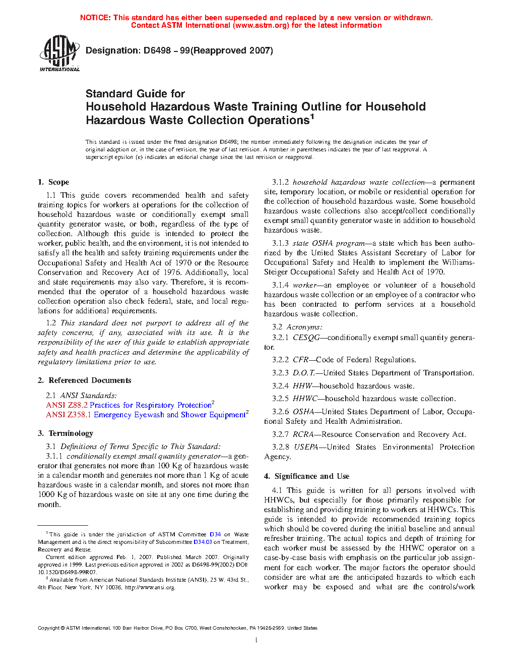 1.1 This guide covers recommended health and safety training topics for workers at operations for the collection of household hazardous waste or conditionally exempt small quantity generator waste, or both, regardless of the type of collection. Although this guide is intended to protect the worker, public health, and the environment, it is not intended to satisfy all the health and safety training requirements under the Occupational Safety and Health Act of 1970 or the Resource Conservation and Recovery Act of 1976. Additionally, local and state requirements may also vary. Therefore, it is recommended that the operator of a household hazardous waste collection operation also check federal, state, and local regulations for additional requirements.