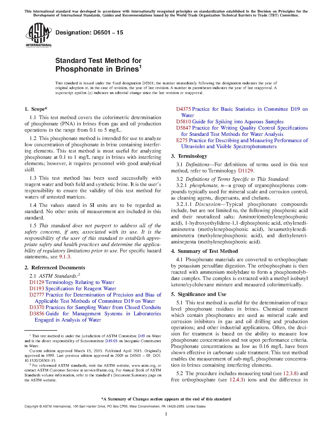 1.2 This phosphonate method is intended for use to analyze low concentration of phosphonate in brine containing interfering elements. This test method is most useful for analyzing phosphonate at 0.1 to 1 mg/L range in brines with interfering elements; however, it requires personnel with good analytical skill.