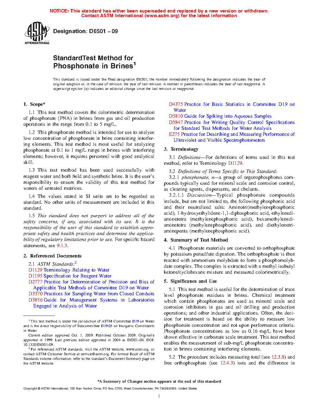 1.2 This phosphonate method is intended for use to analyze low concentration of phosphonate in brine containing interfering elements. This test method is most useful for analyzing phosphonate at 0.1 to 1 mg/L range in brines with interfering elements; however, it requires personnel with good analytical skill.