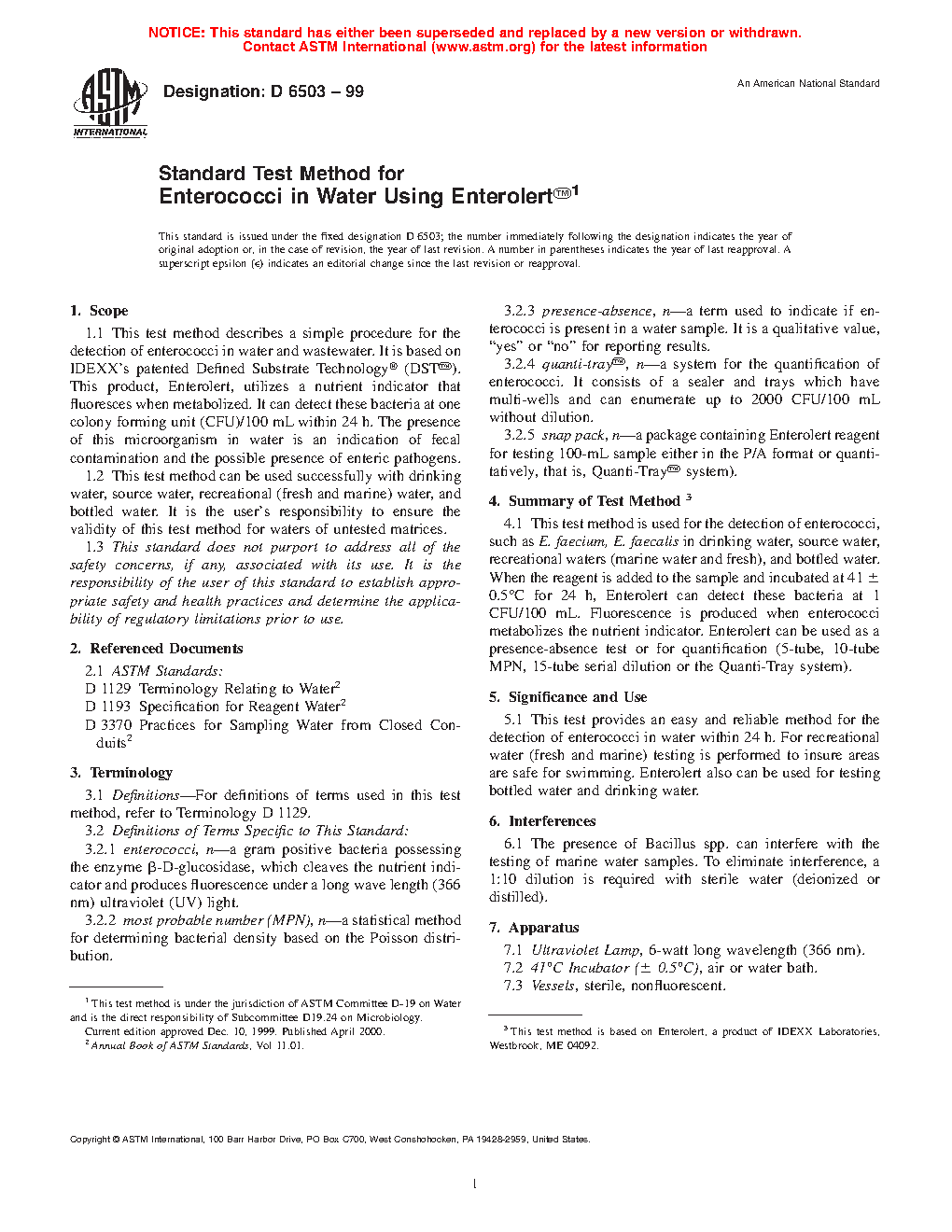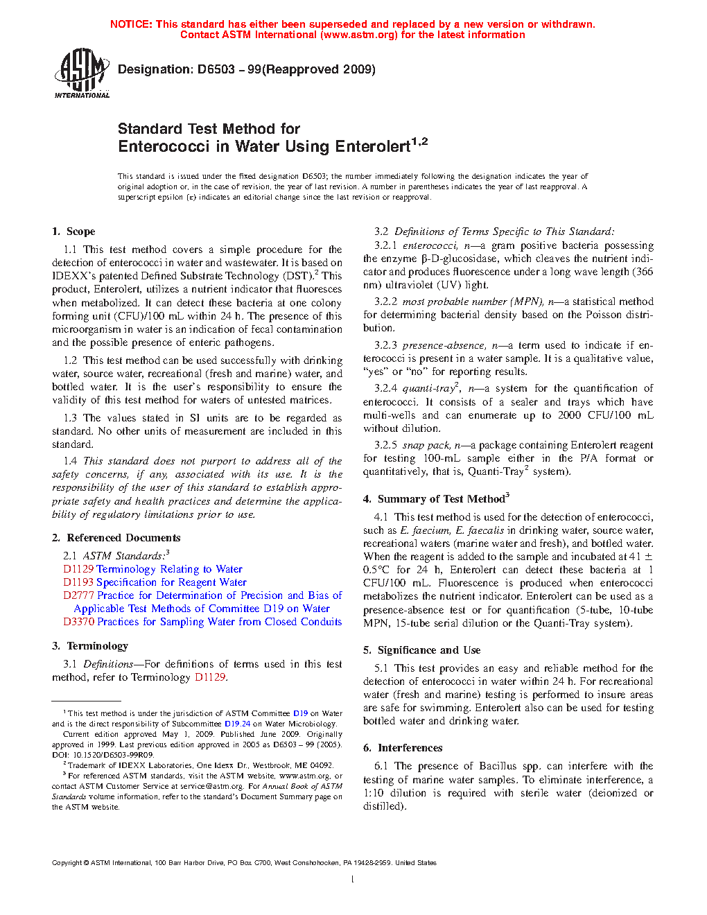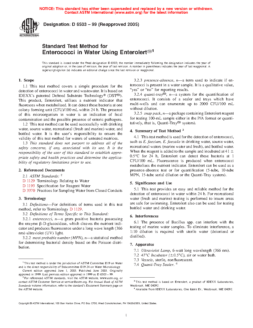 1.1 This test method covers a simple procedure for the detection of enterococci in water and wastewater. It is based on IDEXX’s patented Defined Substrate Technology (DST).2 This product, Enterolert, utilizes a nutrient indicator that fluoresces when metabolized. It can detect these bacteria at one most probable number (MPN)/100 mL within 24 h. The presence of this microorganism in water is an indication of fecal contamination and the possible presence of enteric pathogens.