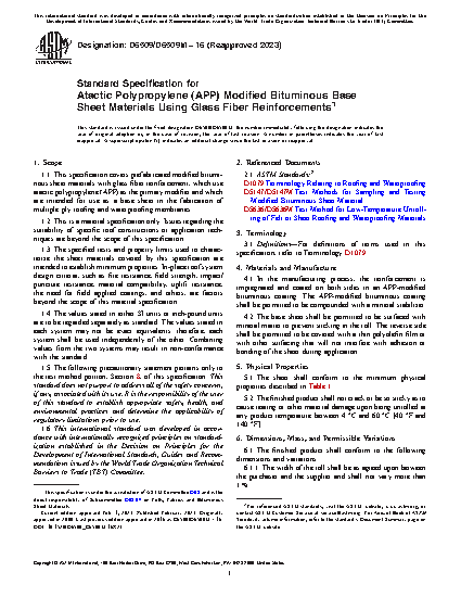 This specification covers prefabricated modified bituminous sheet materials with glass fiber reinforcement, which use atactic polypropylene (APP) as the primary modifier and which are intended for use as a base sheet in the fabrication of multiple ply roofing and waterproofing membranes. The high temperature stability and low temperature unrolling shall be tested to meet the requirements prescribed.