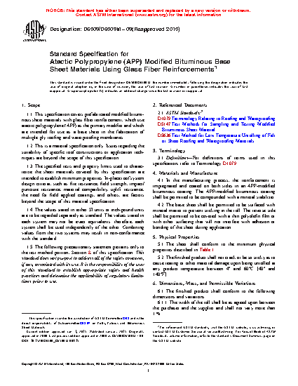 1.1 This specification covers prefabricated modified bituminous sheet materials with glass fiber reinforcement, which use atactic polypropylene (APP) as the primary modifier and which are intended for use as a base sheet in the fabrication of multiple ply roofing and waterproofing membranes.