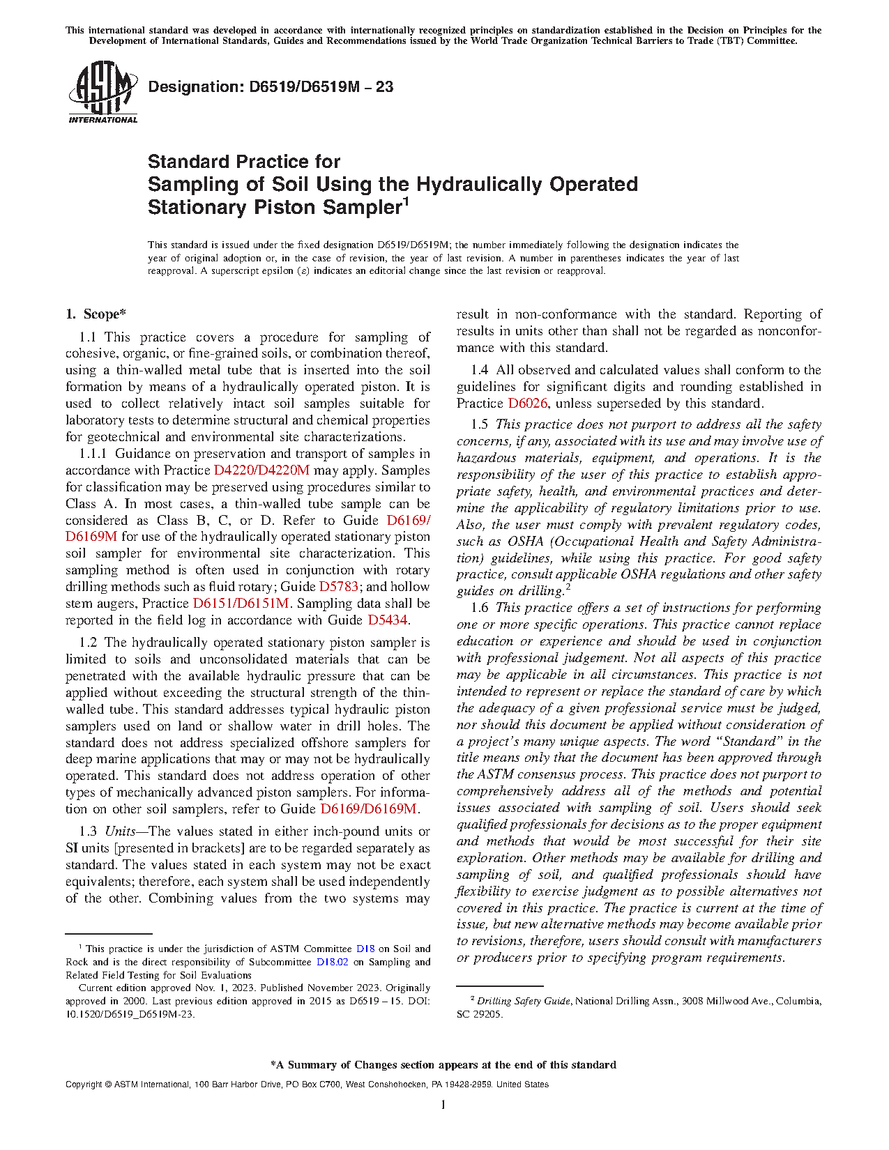 1.5 This practice does not purport to address all the safety concerns, if any, associated with its use and may involve use of hazardous materials, equipment, and operations. It is the responsibility of the user of this practice to establish appropriate safety, health, and environmental practices and determine the applicability of regulatory limitations prior to use. Also, the user must comply with prevalent regulatory codes, such as OSHA (Occupational Health and Safety Administration) guidelines, while using this practice. For good safety practice, consult applicable OSHA regulations and other safety guides on drilling.2
