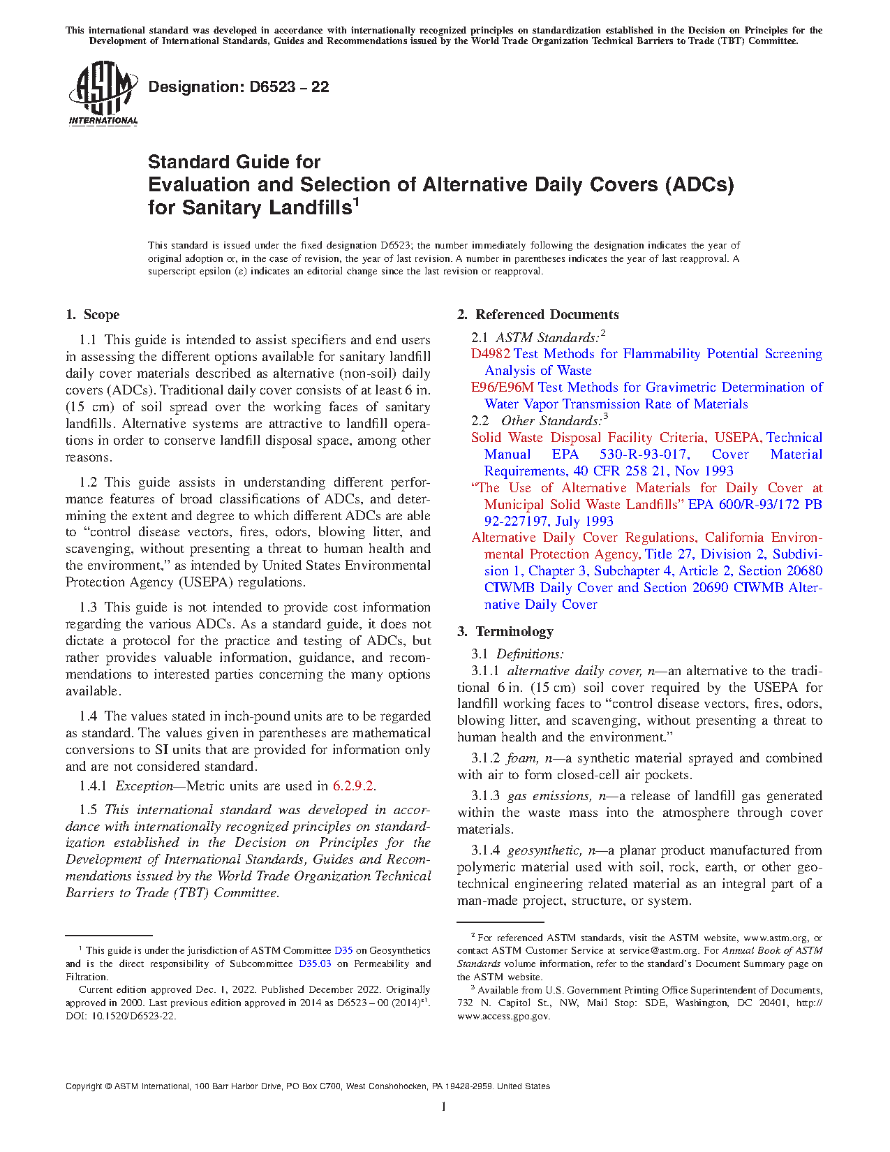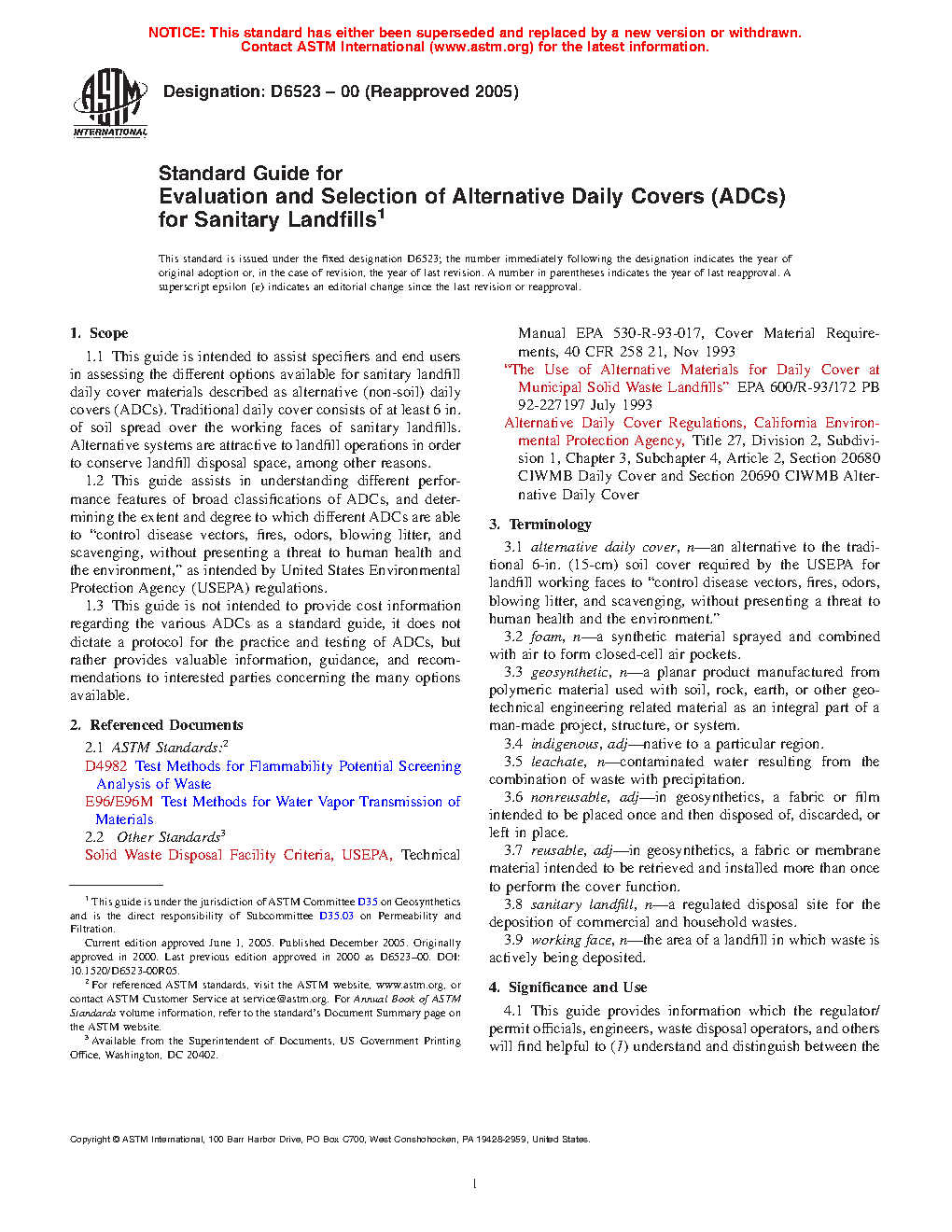 1.1 This guide is intended to assist specifiers and end users in assessing the different options available for sanitary landfill daily cover materials described as alternative (non-soil) daily covers (ADCs). Traditional daily cover consists of at least 6 in. of soil spread over the working faces of sanitary landfills. Alternative systems are attractive to landfill operations in order to conserve landfill disposal space, among other reasons.