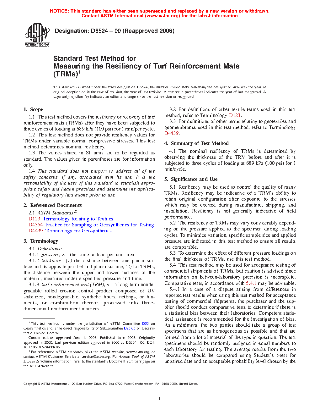 1.2 This test method does not provide resiliency values for TRMs under variable normal compressive stresses. This test method determines nominal resiliency.