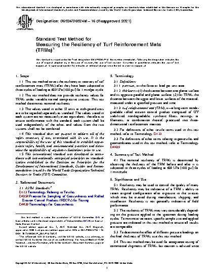 1.1 This test method covers the resiliency or recovery of turf reinforcement mats (TRMs) after they have been subjected to three cycles of loading at 689 kPa [100 psi] for 1 min/per cycle.