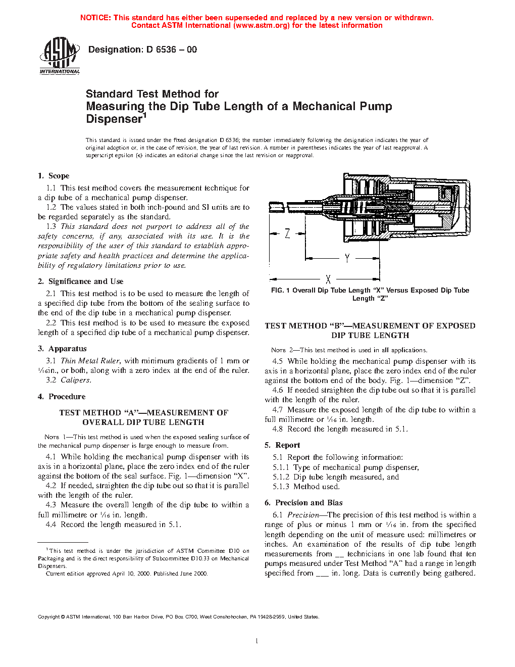 This test method is to be used to measure the length of a specified dip tube from the bottom of the sealing surface to the end of the dip tube in a mechanical pump dispenser.