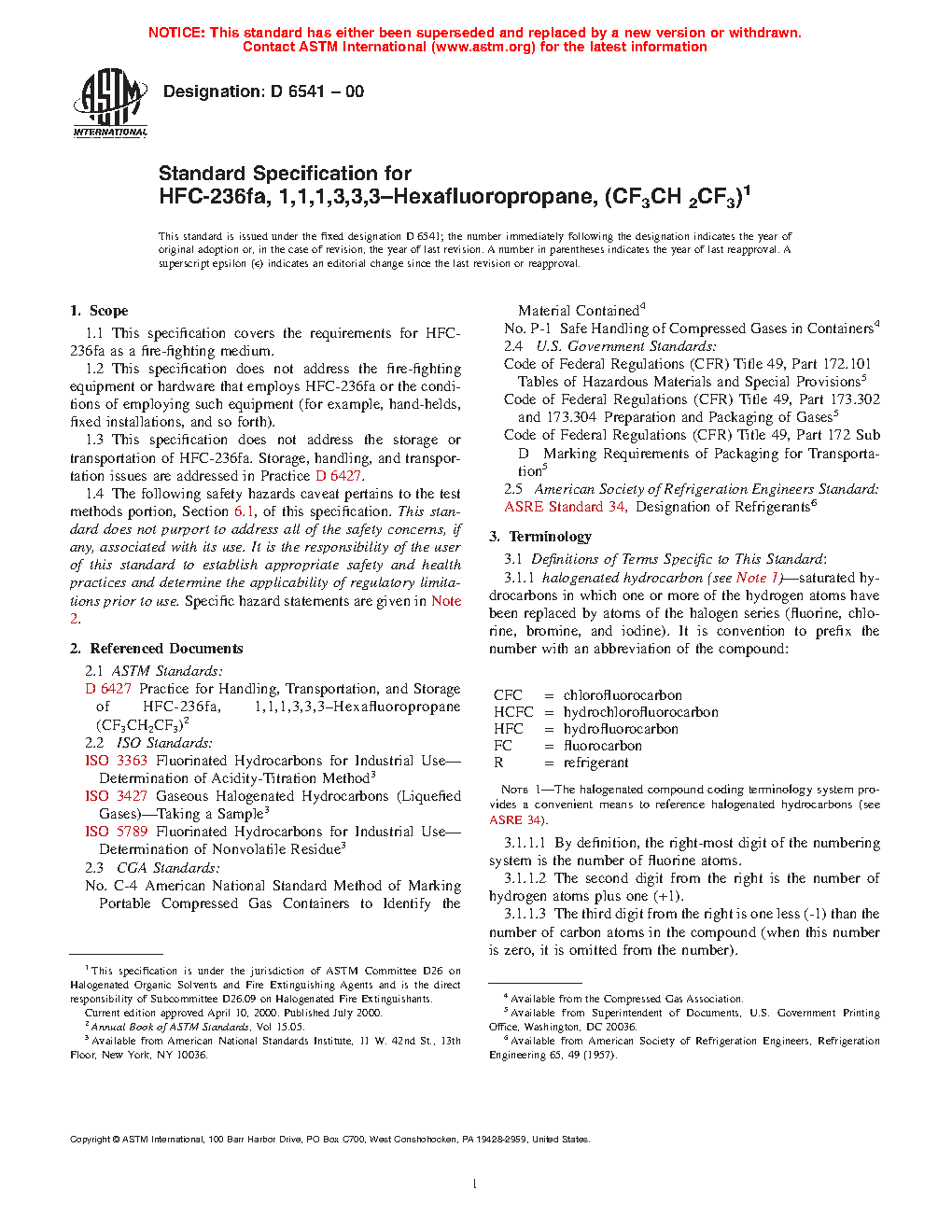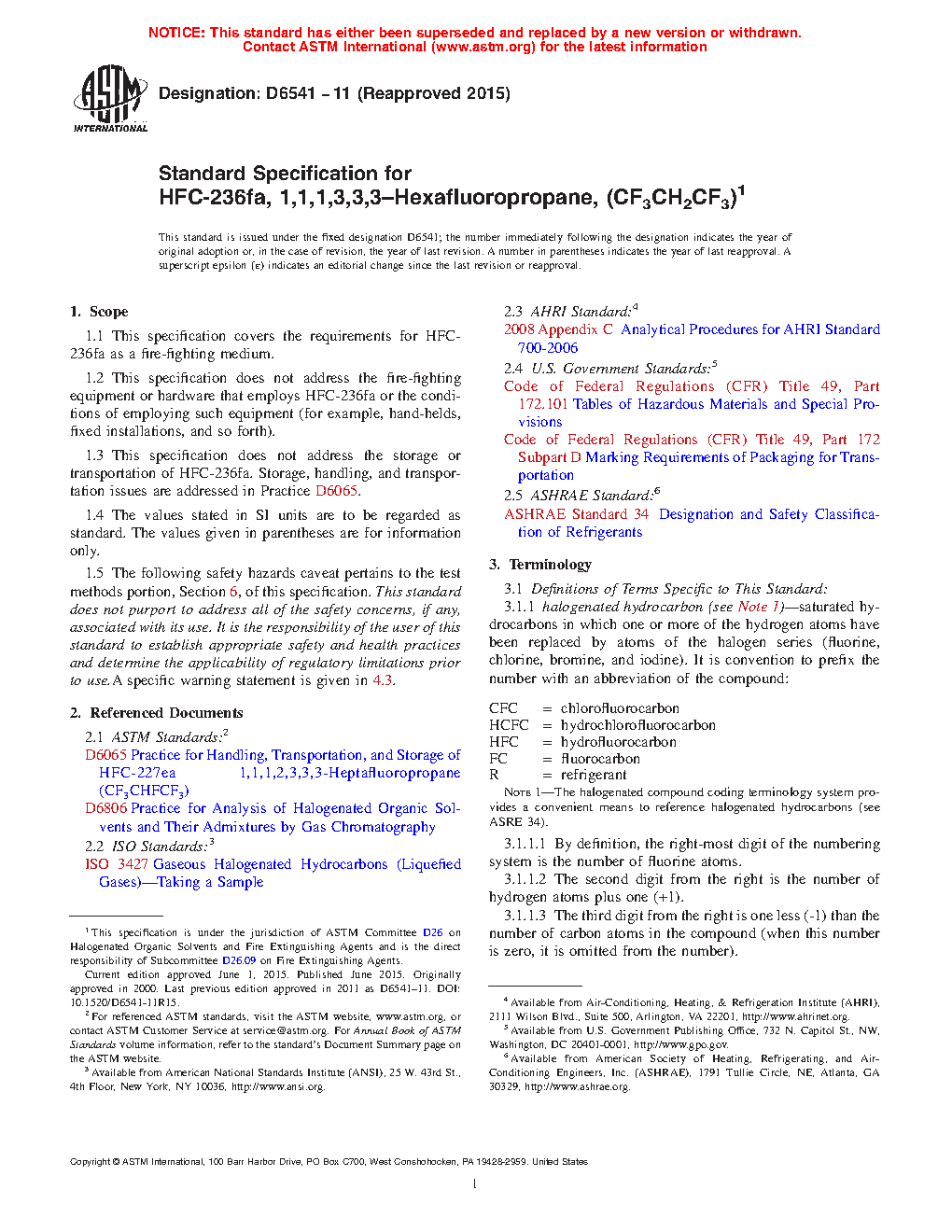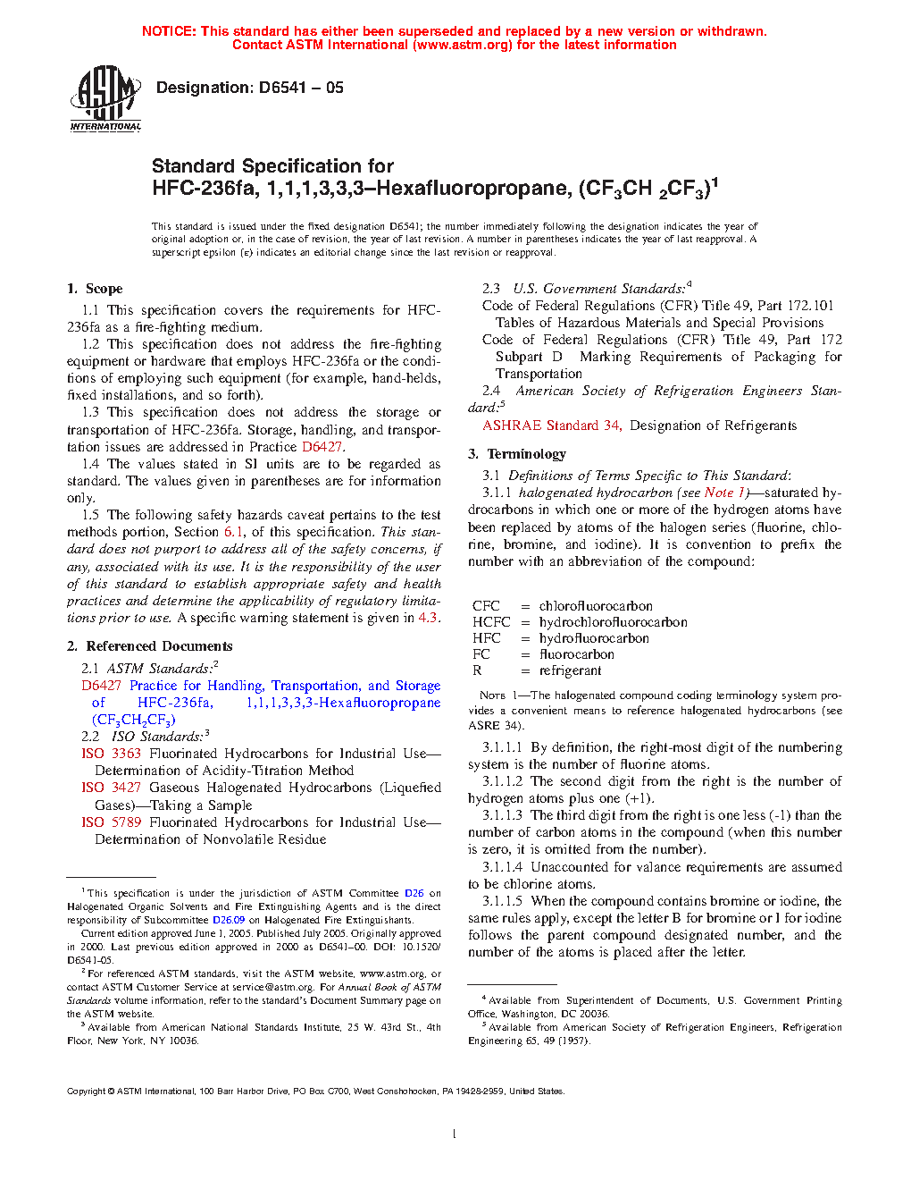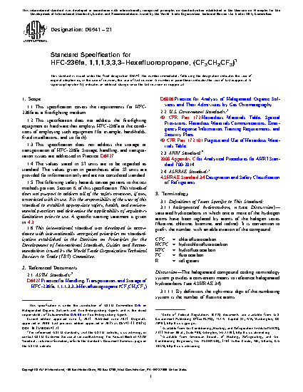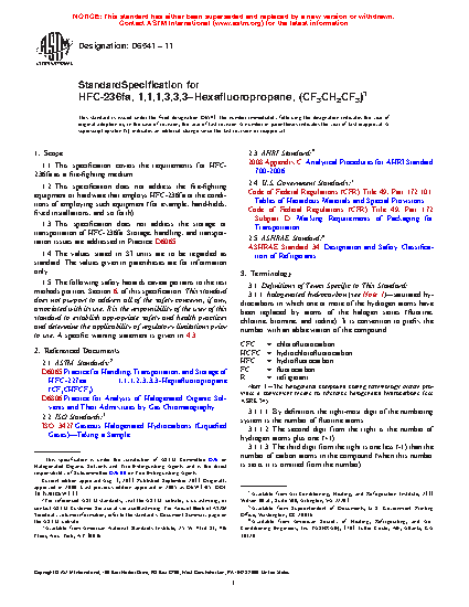 1.3 This specification does not address the storage or transportation of HFC-236fa. Storage, handling, and transportation issues are addressed in Practice D6065.