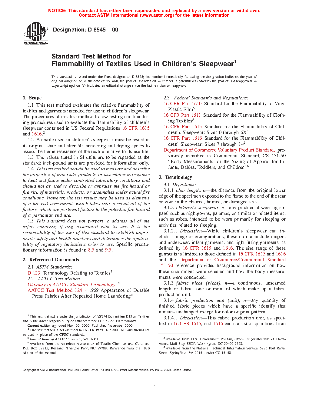 1.3 This method is identical to the method outlined in the regulations 16 CFR 1615 or 1616. The regulation includes additional information such as sampling plans, record keeping requirements, and interpretations for compliance applicable to children’s sleepwear. Please consult 16 CFR 1615 and 1616 for these operations and interpretations.