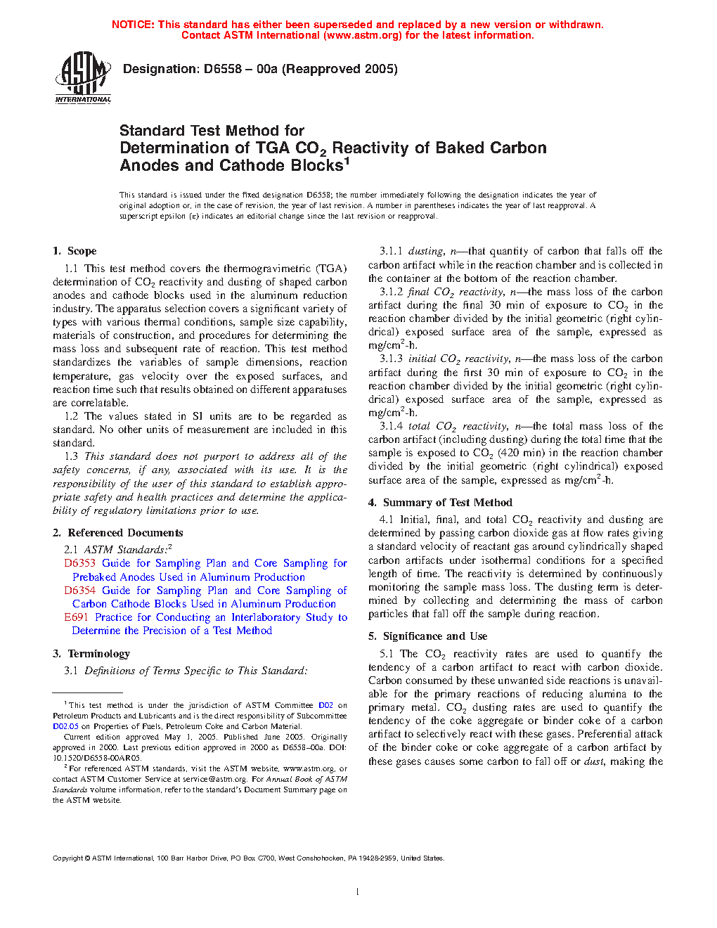 1.1 This test method covers the thermogravimetric (TGA) determination of CO2 reactivity and dusting of shaped carbon anodes and cathode blocks used in the aluminum reduction industry. The apparatus selection covers a significant variety of types with various thermal conditions, sample size capability, materials of construction, and procedures for determining the mass loss and subsequent rate of reaction. This test method standardizes the variables of sample dimensions, reaction temperature, gas velocity over the exposed surfaces and reaction time such that results obtained on different apparatuses are correlatable.