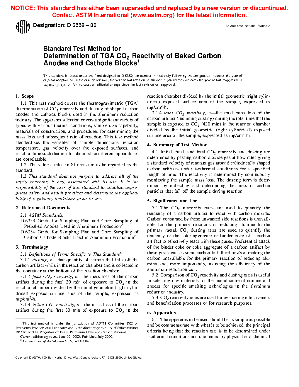 The CO2 reactivity rates are used to quantify the tendency of a carbon artifact to react with carbon dioxide. Carbon consumed by these unwanted side reactions is unavailable for the primary reactions of reducing alumina to the primary metal. CO2 dusting rates are used to quantify the tendency of the coke aggregate or binder coke of a carbon artifact to selectively react with these gases. Preferential attack of the binder coke or coke aggregate of a carbon artifact by these gases causes some carbon to fall off or dust, making the carbon unavailable for the primary reaction of reducing alumina and, more importantly, reducing the efficiency of the aluminum reduction cell.