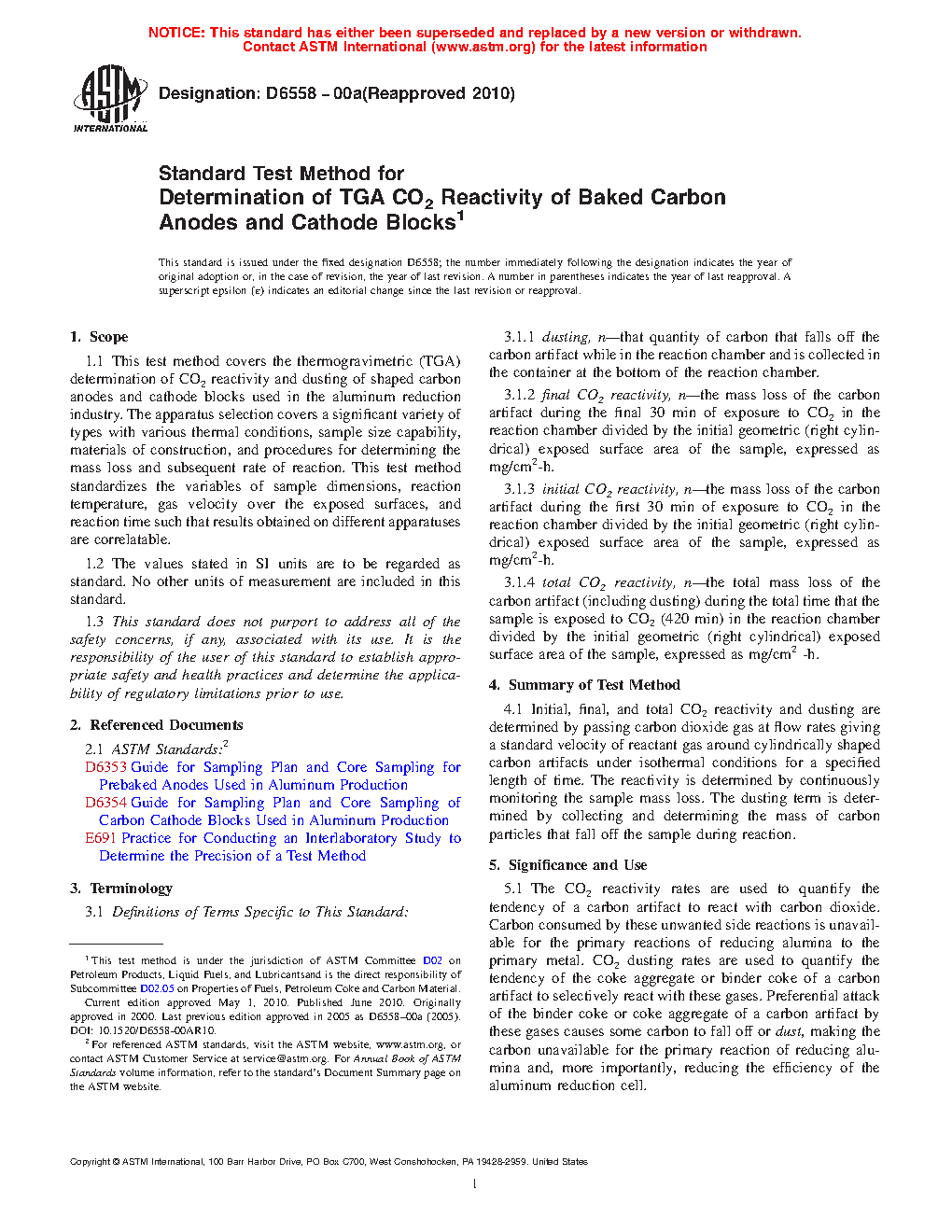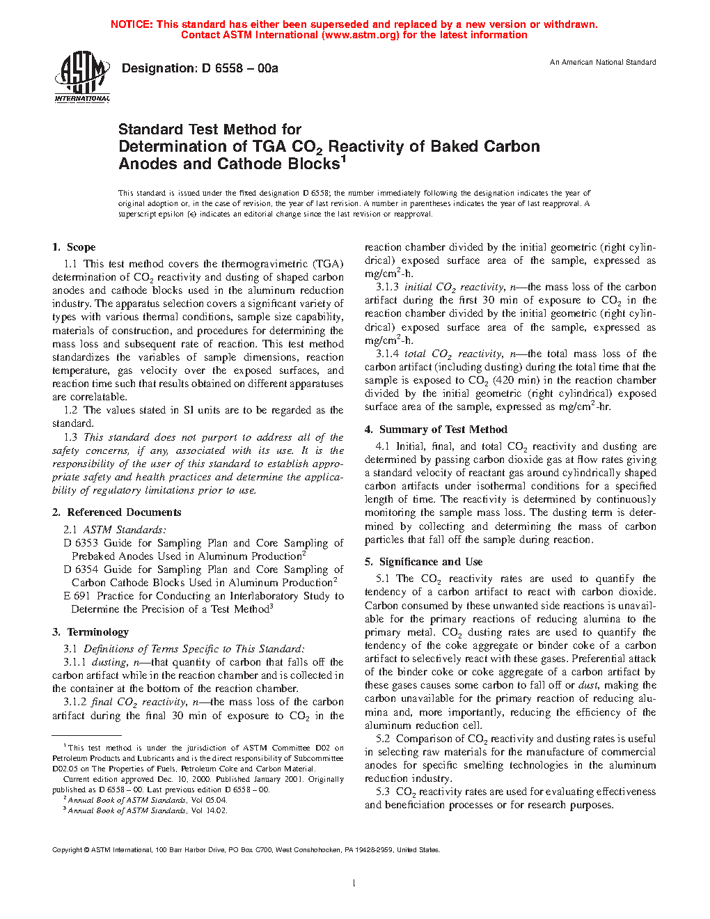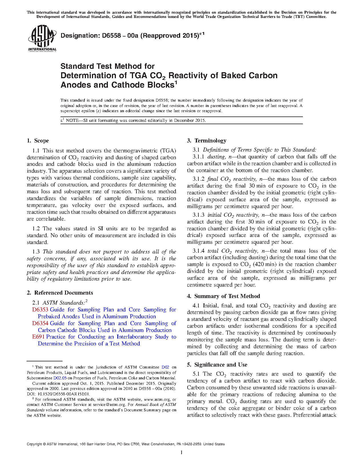 1.1 This test method covers the thermogravimetric (TGA) determination of CO2 reactivity and dusting of shaped carbon anodes and cathode blocks used in the aluminum reduction industry. The apparatus selection covers a significant variety of types with various thermal conditions, sample size capability, materials of construction, and procedures for determining the mass loss and subsequent rate of reaction. This test method standardizes the variables of sample shape, reaction temperature, gas velocity over the exposed surfaces, and reaction time such that results obtained on different apparatuses are correlatable.