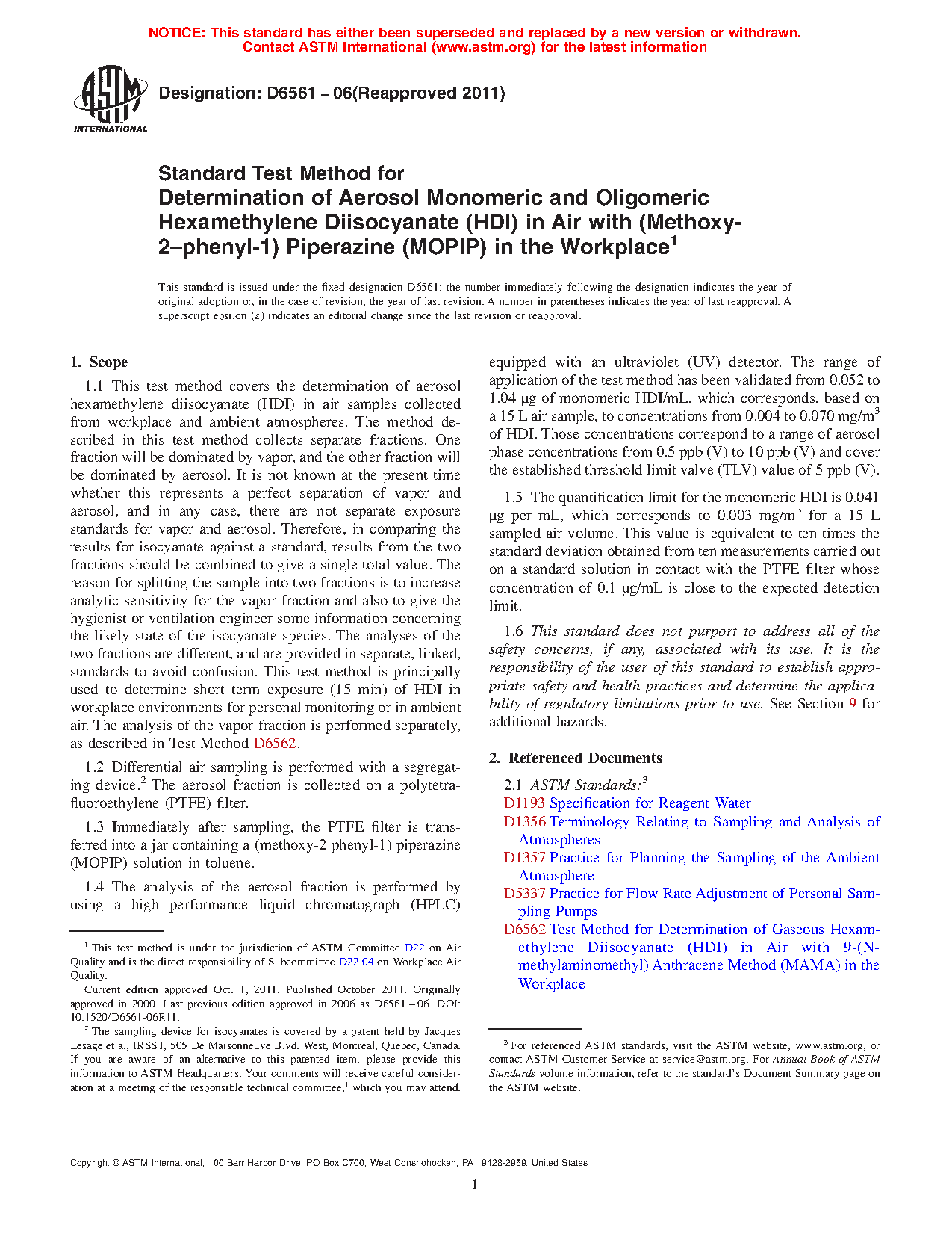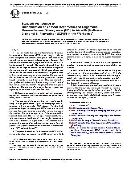 1.1 This test method covers the determination of aerosol hexamethylene diisocyanate (HDI) in air samples collected from workplace and ambient atmospheres. The method described in this test method collects separate fractions. One fraction will be dominated by vapor, and the other fraction will be dominated by aerosol. The results obtained from the analysis of the separate fractions do not necessarily represent the true partition of the measured HDI physical phases, and should only be considered a representation of the general trend in the physical phase partition within samples. The analyses of the two fractions are different, and are provided in separate, linked, standards to avoid confusion. This test method is principally used to determine short term exposure (15 min) of HDI in workplace environments for personal monitoring or in ambient air. The analysis of the vapor fraction is performed separately, as described in Test Method D6562.