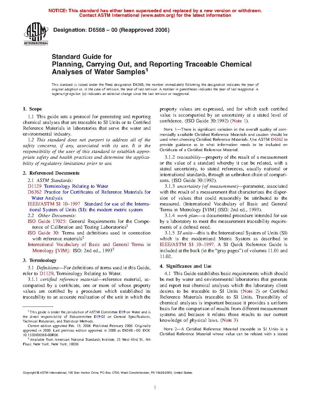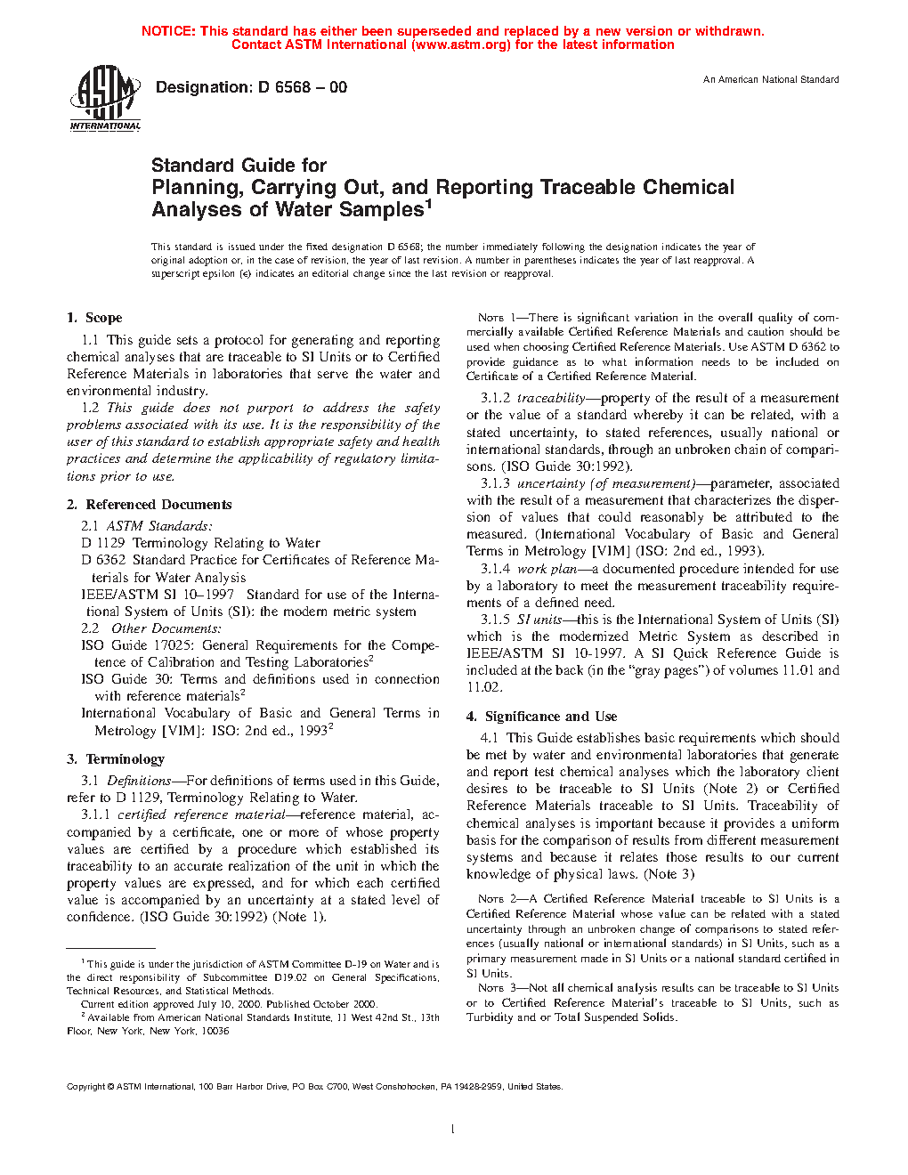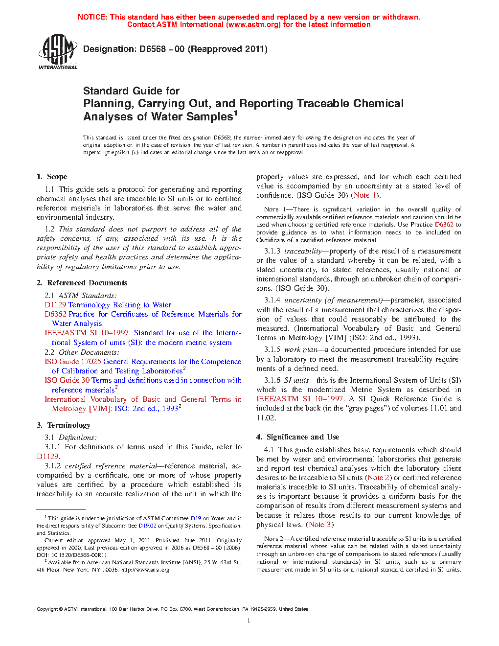 4.1 This guide establishes basic requirements for water and environmental laboratories that generate and report test chemical analyses that the laboratory client desires to be traceable to the SI or to certified reference materials traceable to the SI (Note 1). Traceability of chemical analyses is important because it provides a uniform basis for the comparison of results from different measurement systems and because it relates those results to our current knowledge of physical laws (Note 2).