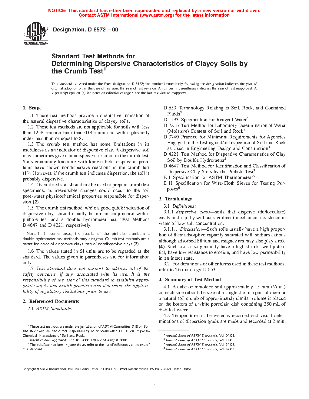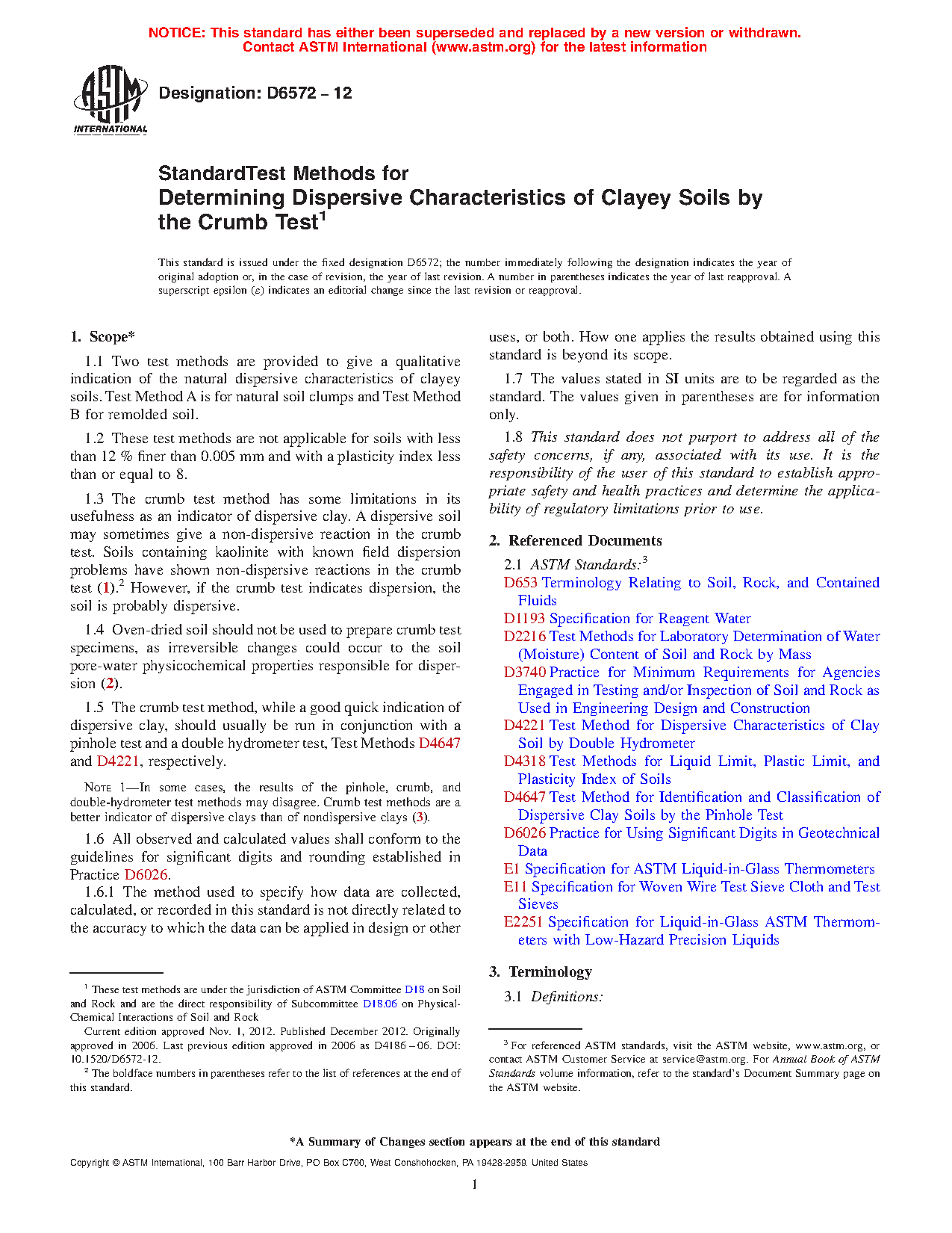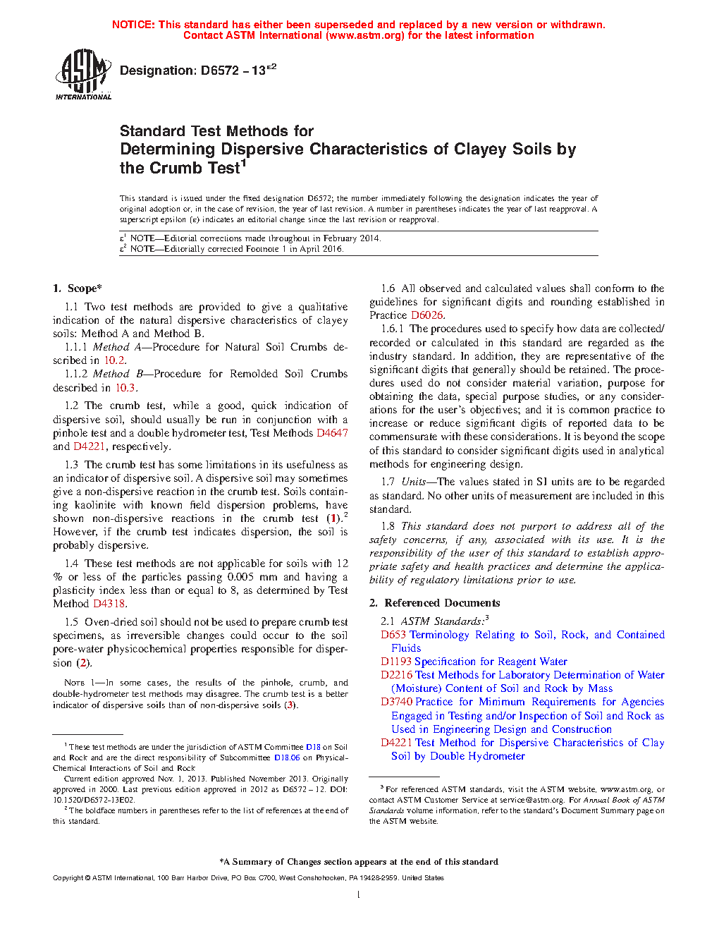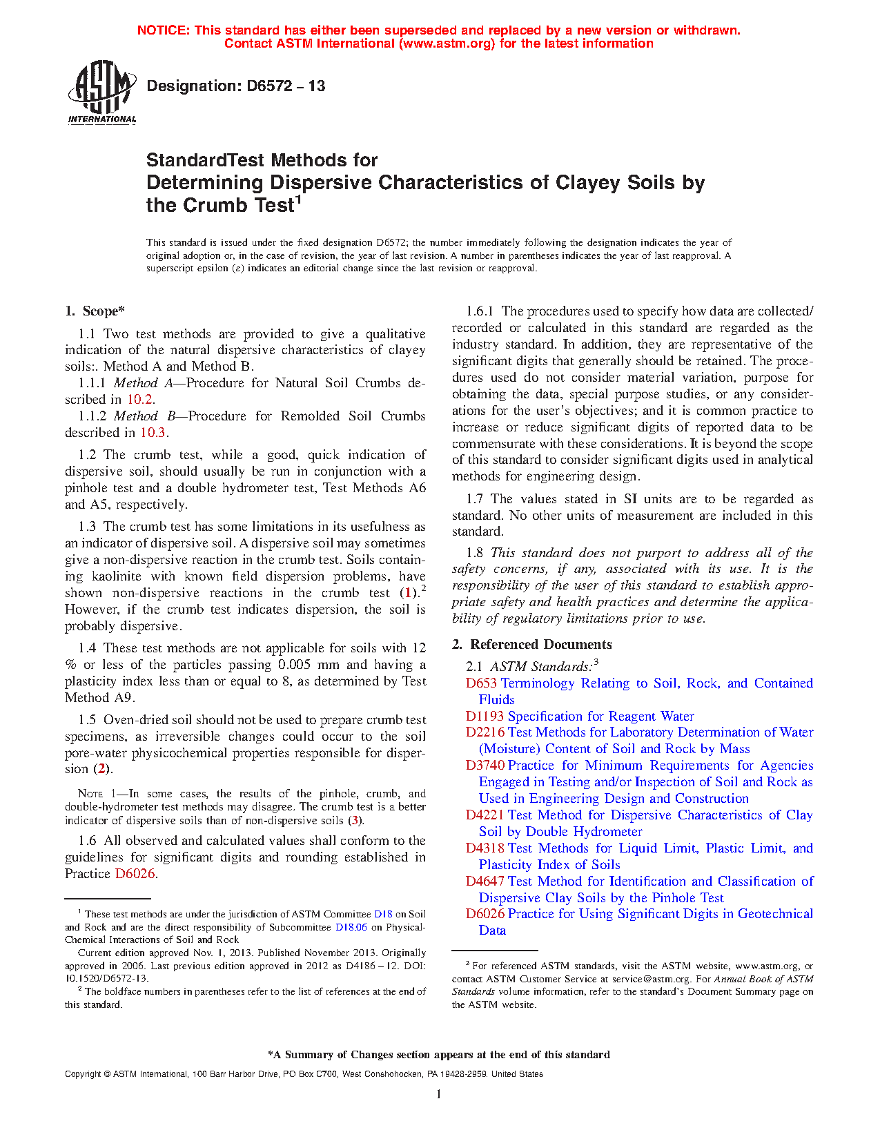 1.1 Two test methods are provided to give a qualitative indication of the natural dispersive characteristics of clayey soils:. Method A and Method B.