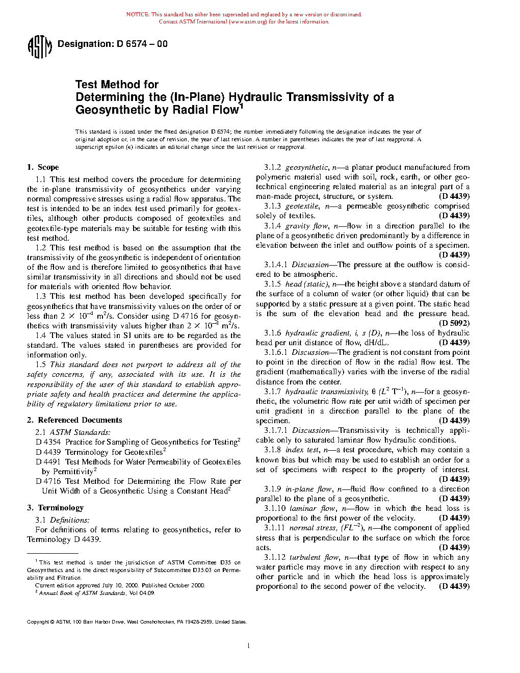 1.3 This test method has been developed specifically for geosynthetics that have transmissivity values on the order of or less than 2 x 10-4 m2/s. Consider using D4716 for geosynthetics with transmissivity values higher than 2 x 10-4 m2/s.