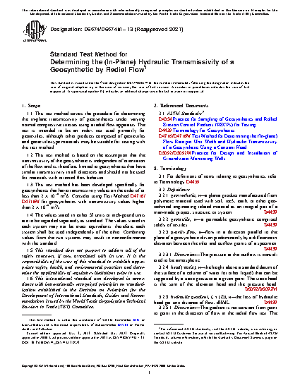 1.1 This test method covers the procedure for determining the in-plane transmissivity of geosynthetics under varying normal compressive stresses using a radial flow apparatus. The test is intended to be an index test used primarily for geotextiles, although other products composed of geotextiles and geotextile-type materials may be suitable for testing with this test method.