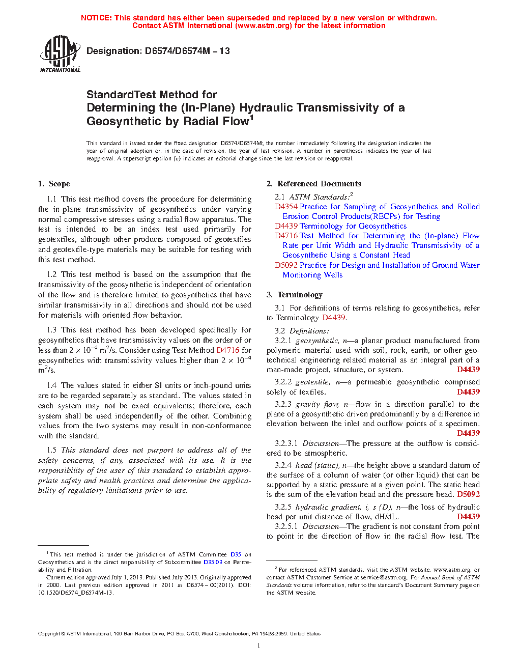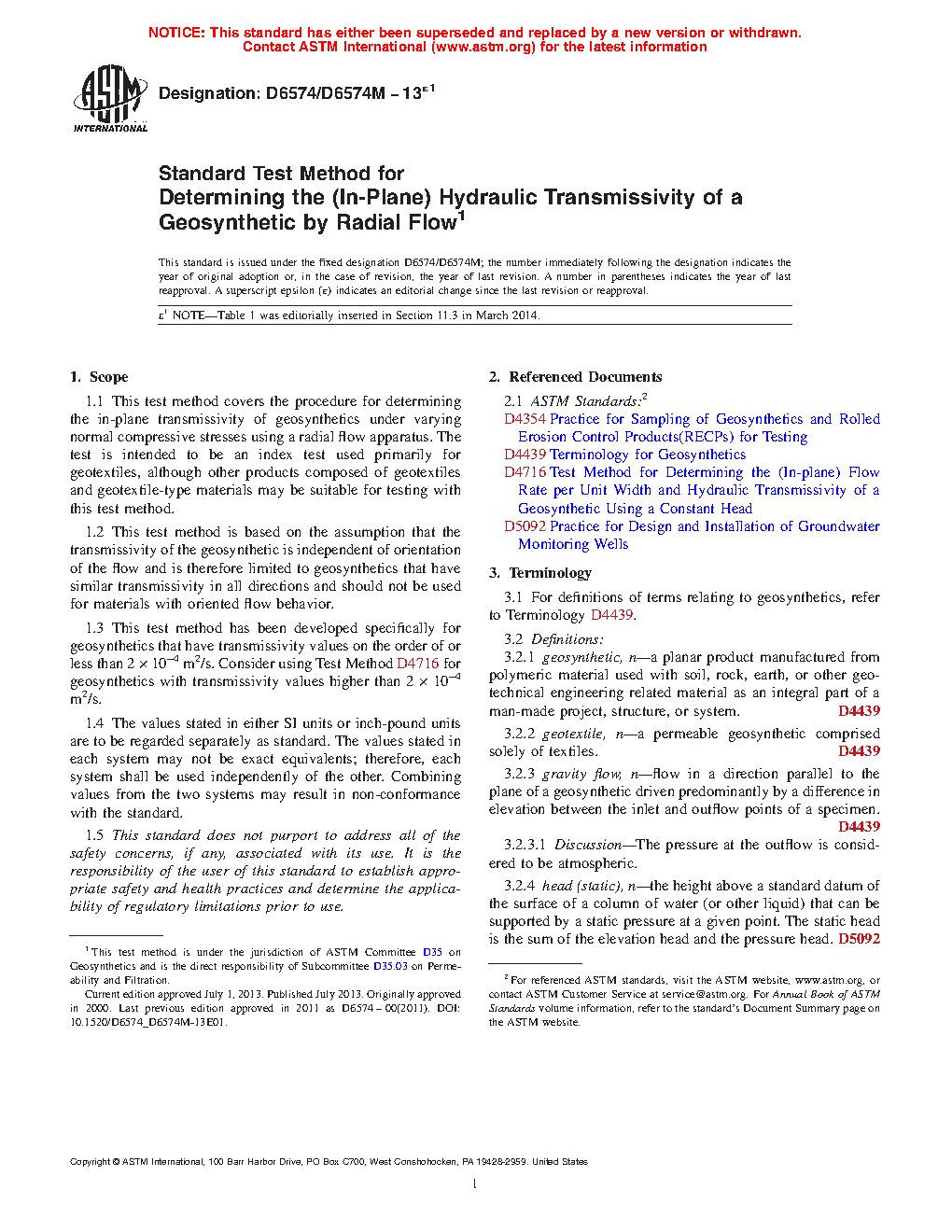 1.3 This test method has been developed specifically for geosynthetics that have transmissivity values on the order of or less than 2 × 10−4 m2/s. Consider using Test Method D4716 for geosynthetics with transmissivity values higher than 2 × 10−4 m2/s.