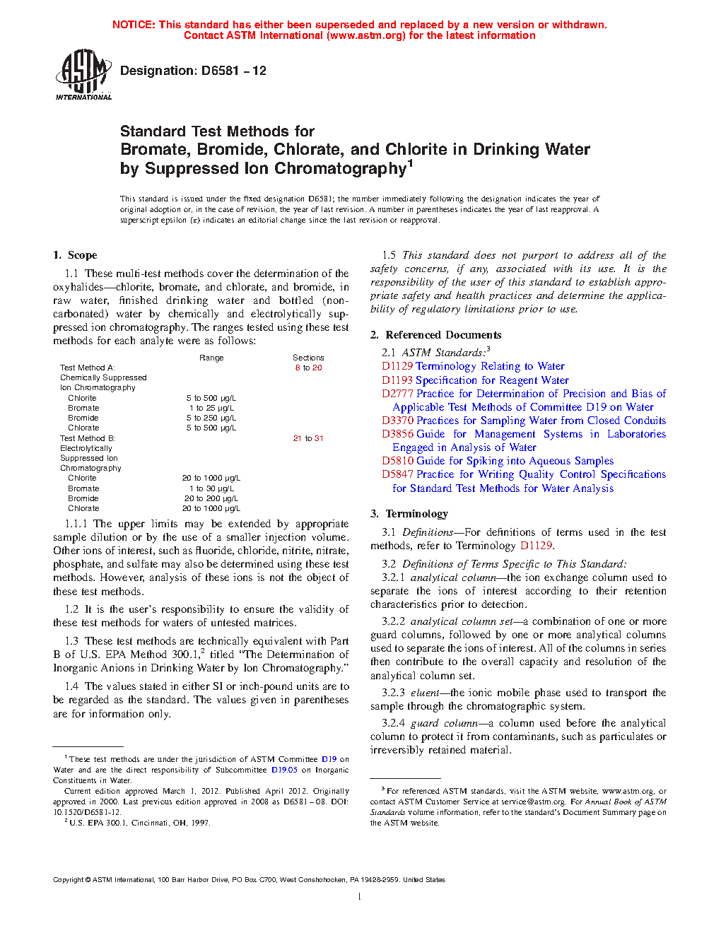 1.1 These multi-test methods cover the determination of the oxyhalides—chlorite, bromate, and chlorate, and bromide, in raw water, finished drinking water and bottled (non-carbonated) water by chemically and electrolytically suppressed ion chromatography. The ranges tested using these test methods for each analyte were as follows: