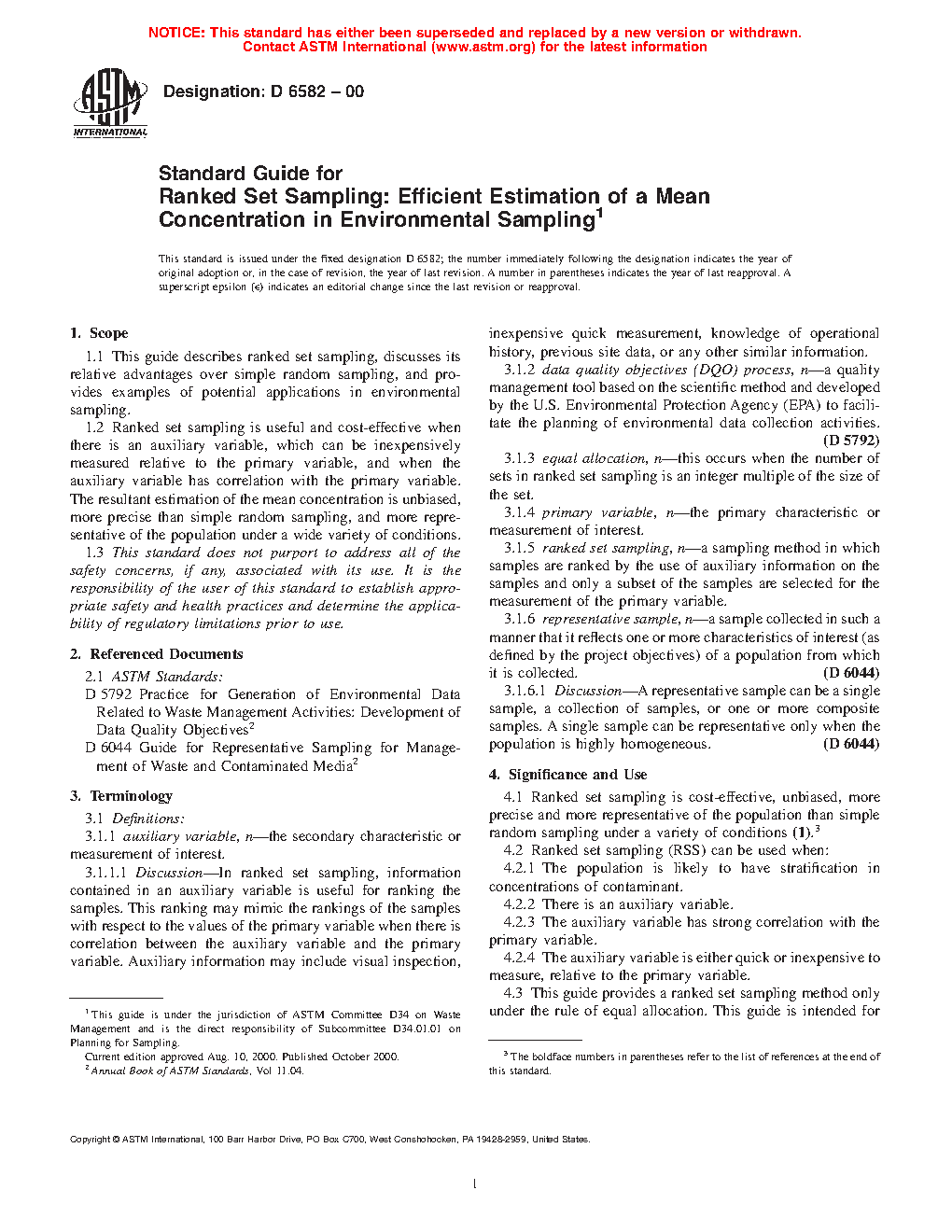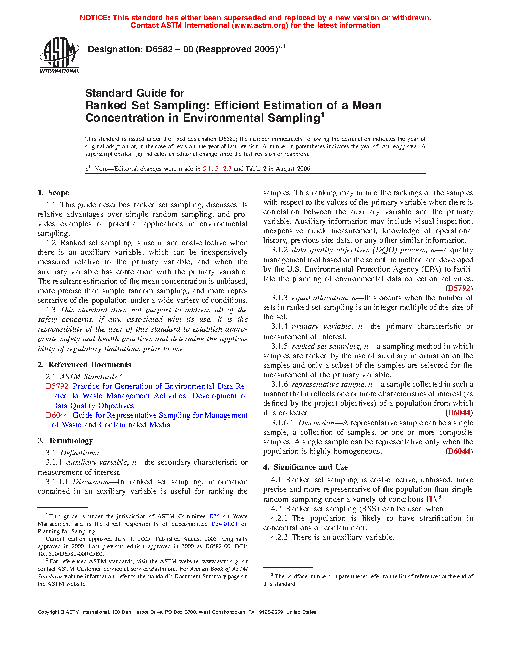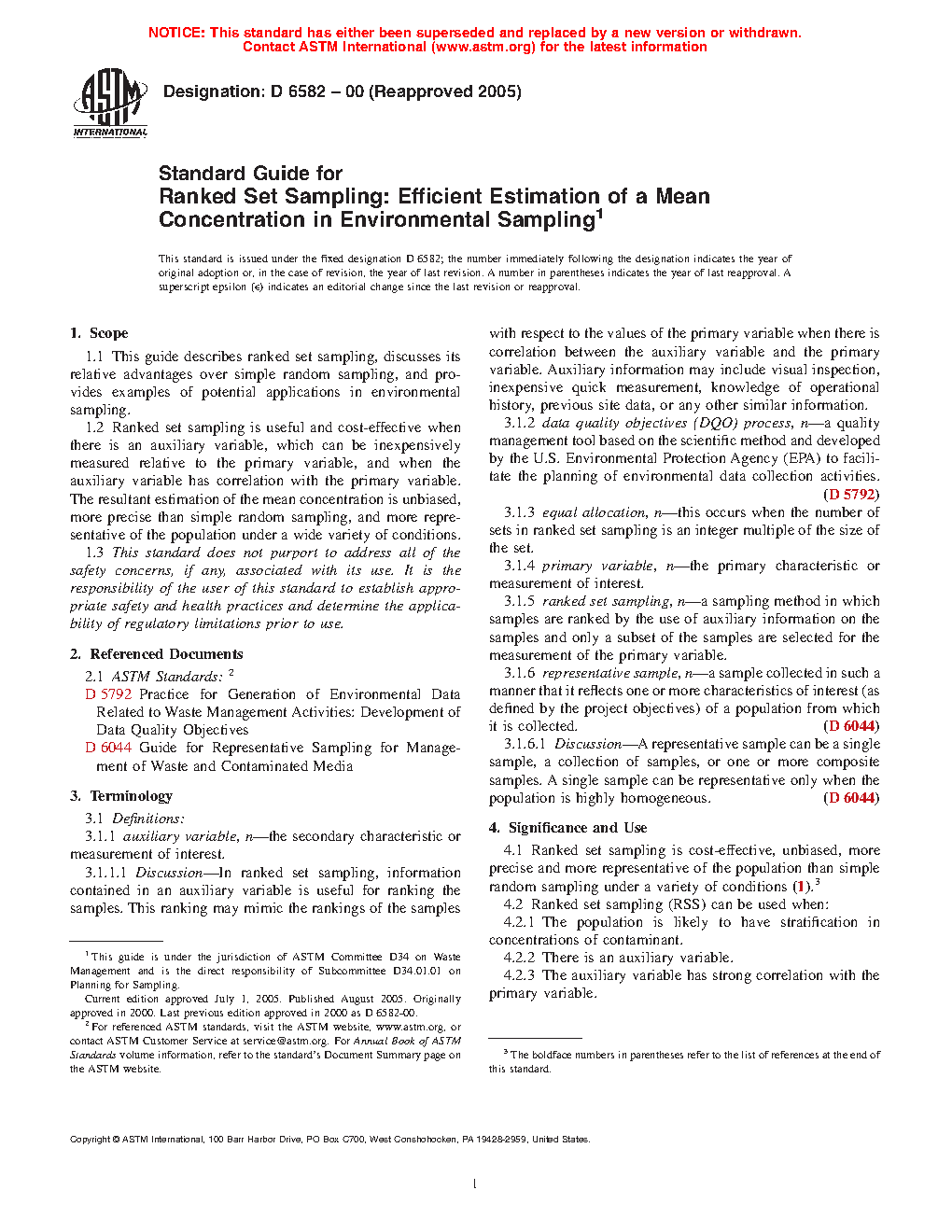 1.1 This guide describes ranked set sampling, discusses its relative advantages over simple random sampling, and provides examples of potential applications in environmental sampling.
