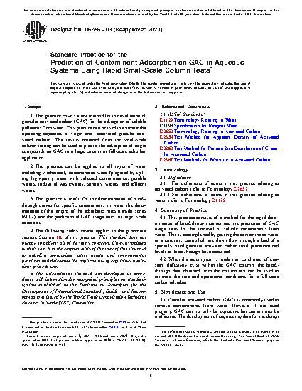 1.1 This practice covers a test method for the evaluation of granular activated carbon (GAC) for the adsorption of soluble pollutants from water. This practice can be used to estimate the operating capacities of virgin and reactivated granular activated carbons. The results obtained from the small-scale column testing can be used to predict the adsorption of target compounds on GAC in a large column or full-scale adsorber application.