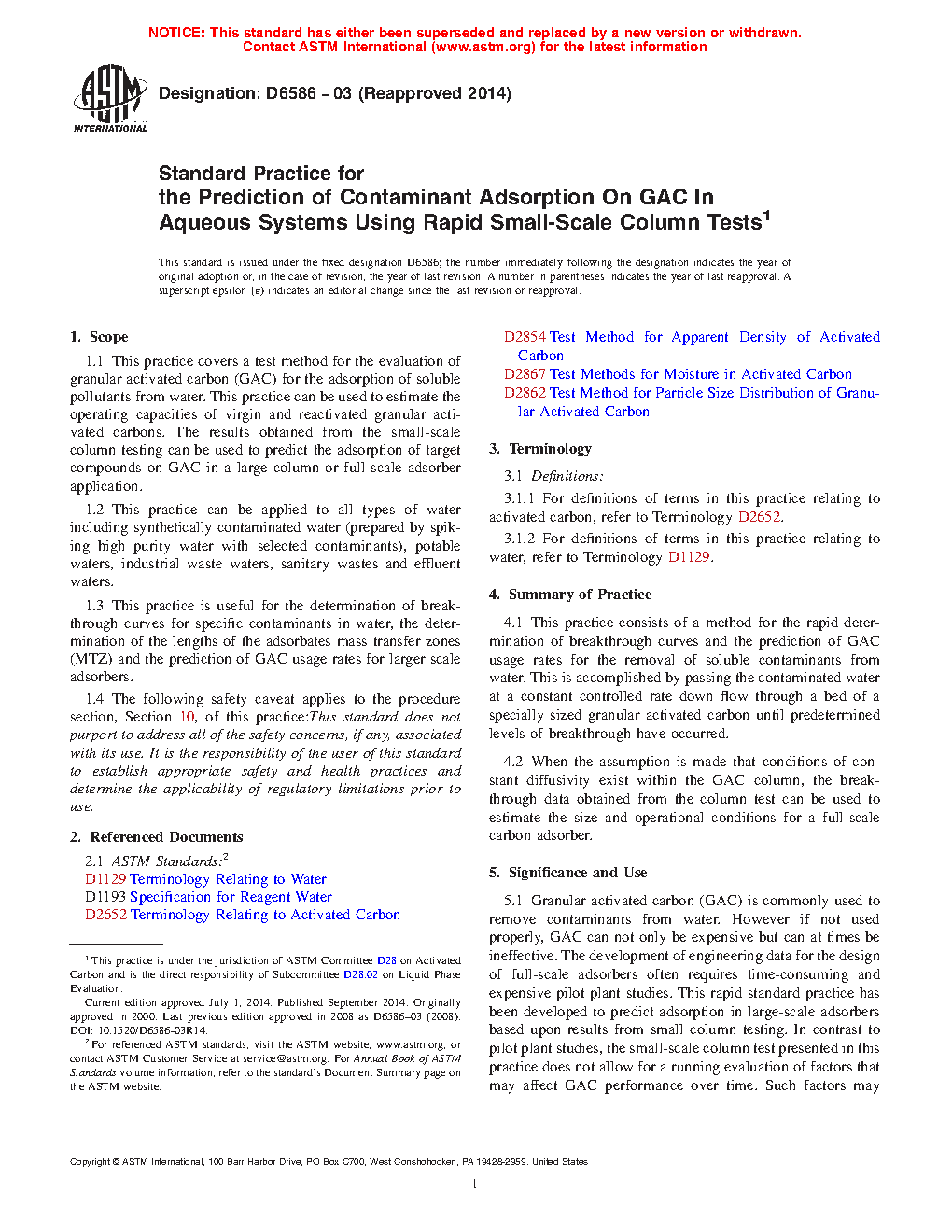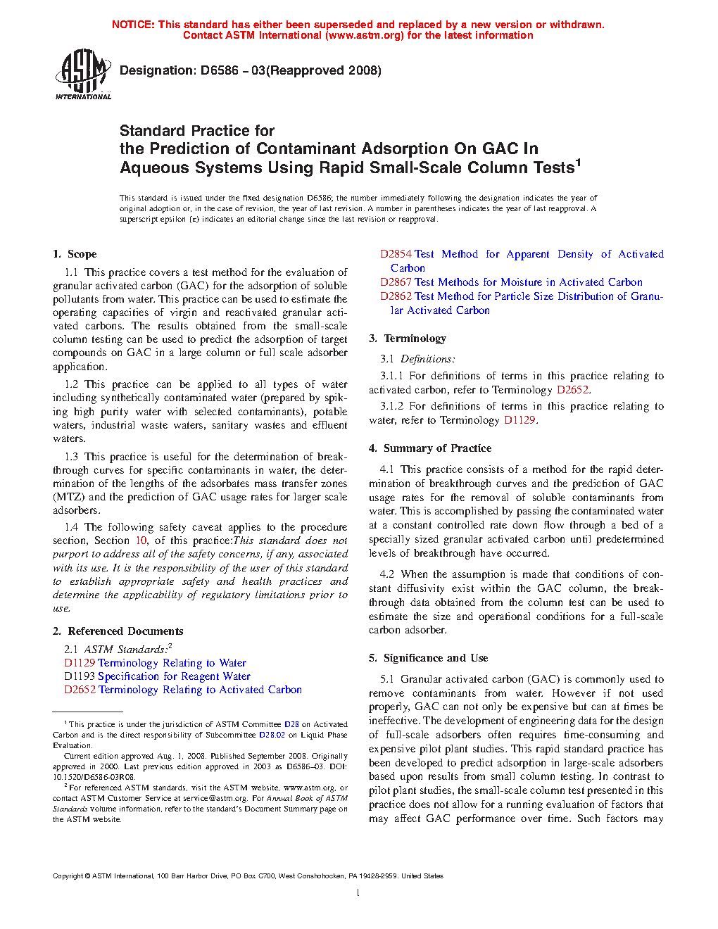 1.3 This practice is useful for the determination of breakthrough curves for specific contaminants in water, the determination of the lengths of the adsorbates mass transfer zones (MTZ), and the prediction of GAC usage rates for larger scale adsorbers.