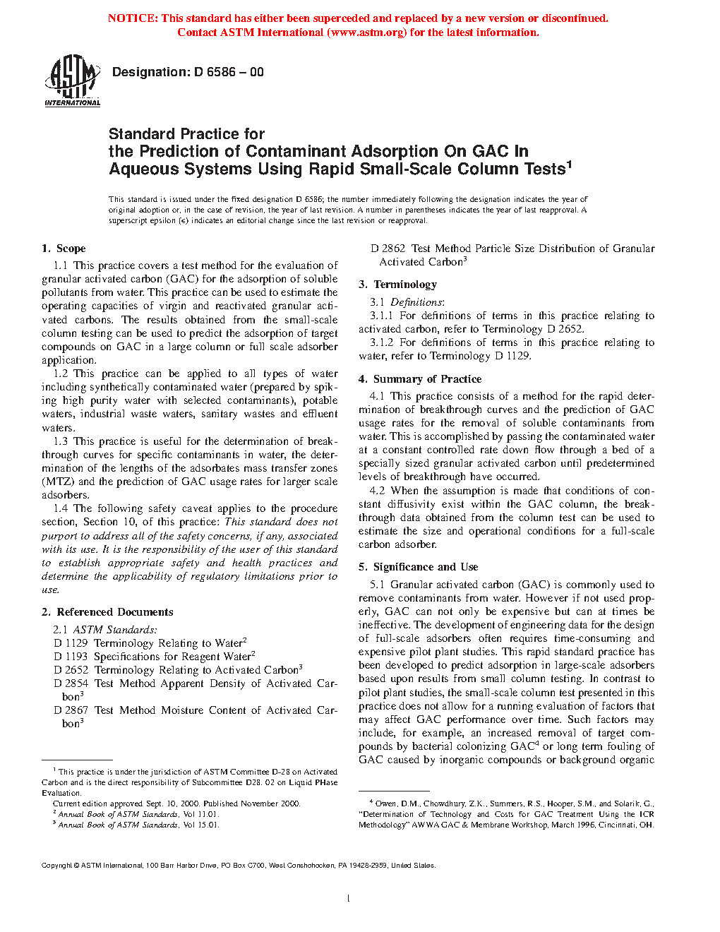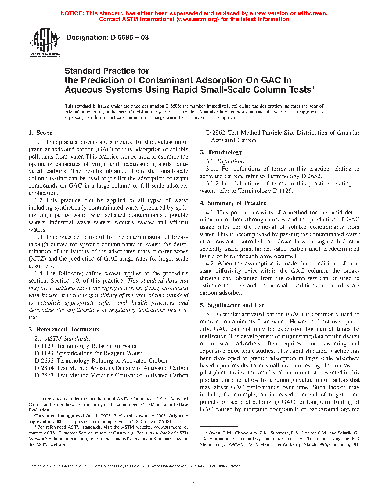 5.1 Granular activated carbon (GAC) is commonly used to remove contaminants from water. However if not used properly, GAC can not only be expensive but can at times be ineffective. The development of engineering data for the design of full-scale adsorbers often requires time-consuming and expensive pilot plant studies. This rapid standard practice has been developed to predict adsorption in large-scale adsorbers based upon results from small column testing. In contrast to pilot plant studies, the small-scale column test presented in this practice does not allow for a running evaluation of factors that may affect GAC performance over time. Such factors may include, for example, an increased removal of target compounds by bacterial colonizing GAC3 or long-term fouling of GAC caused by inorganic compounds or background organic matter.4 Nevertheless, this practice offers more relevant operational data than isotherm testing without the principal drawbacks of pilot plant studies, namely time and expense; and unlike pilot plant studies, small-scale studies can be performed in a laboratory using water sampled from a remote location.