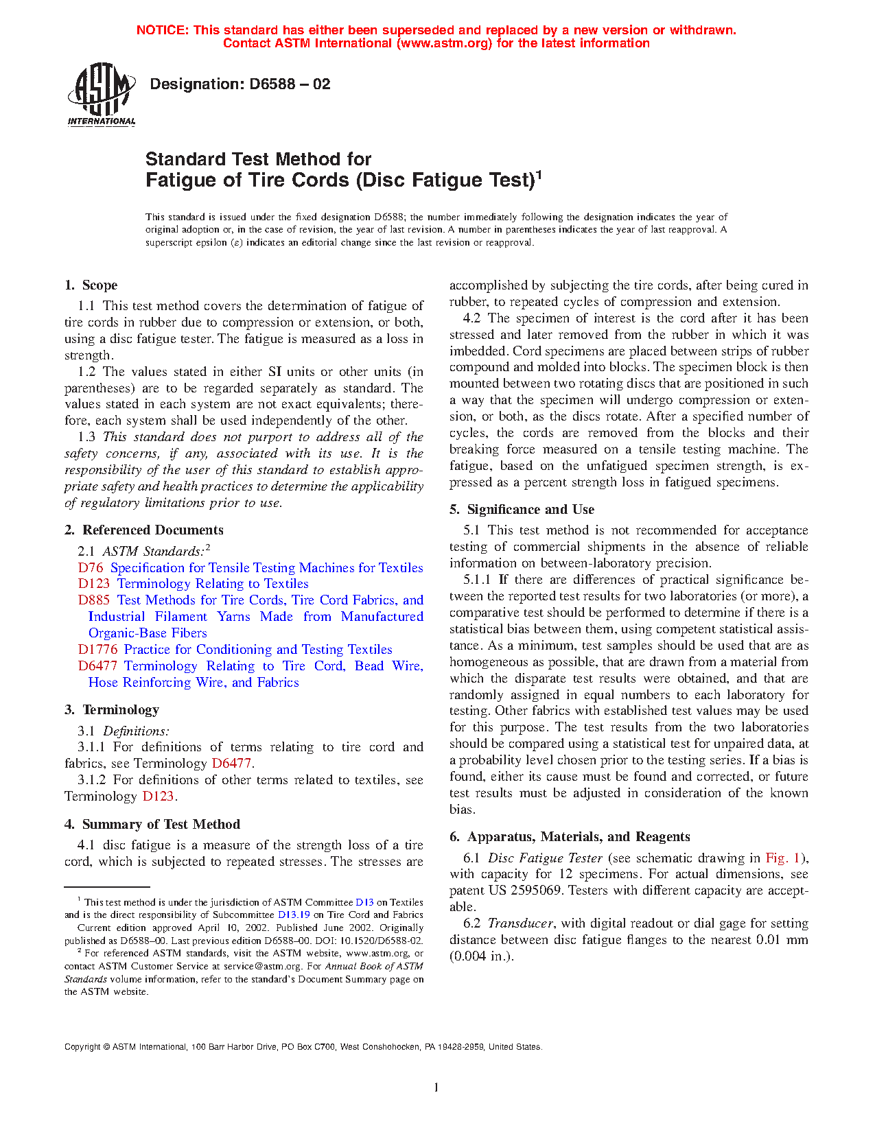 1.1 This test method covers the determination of fatigue of tire cords in rubber due to compression or extension, or both, using a disc fatigue tester. The fatigue is measured as a loss in strength.