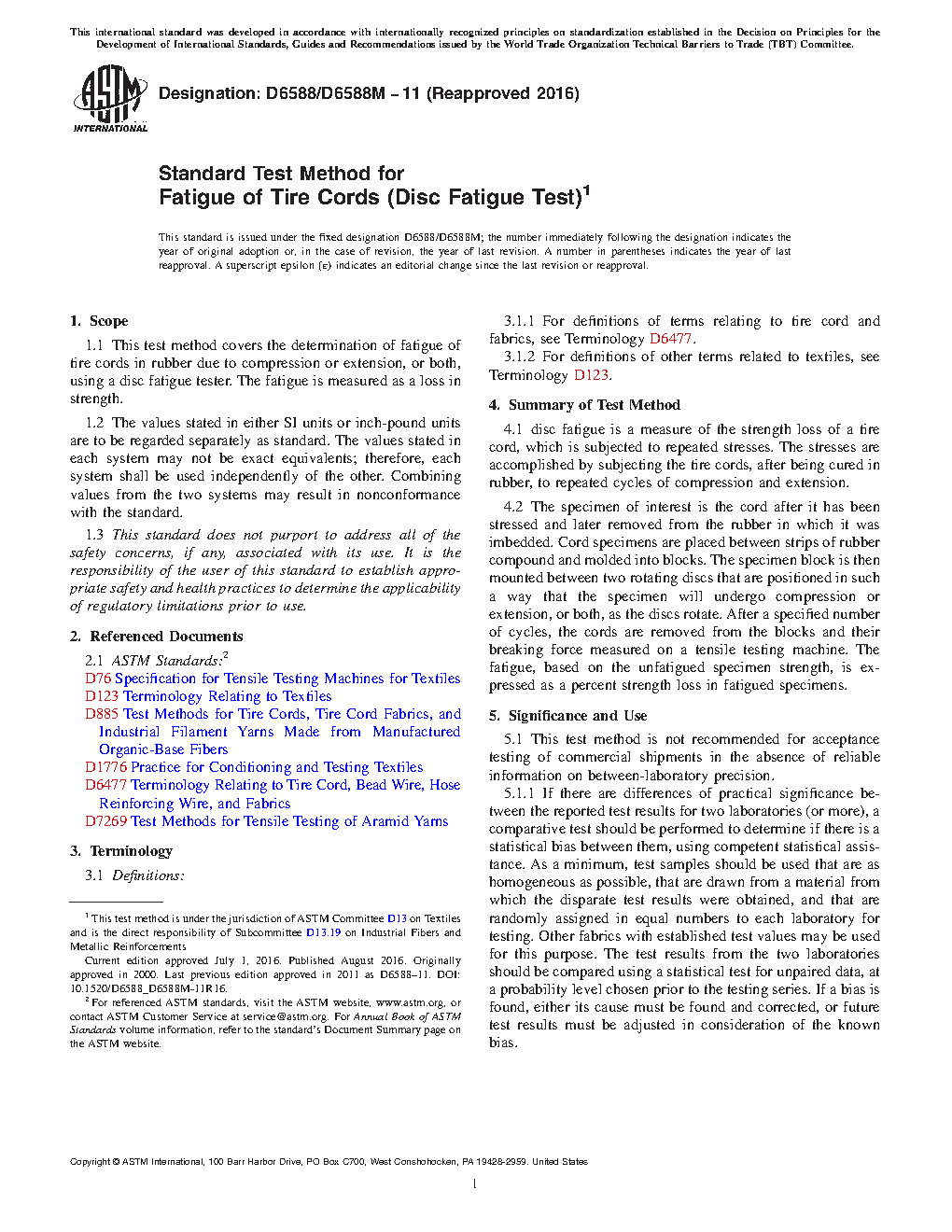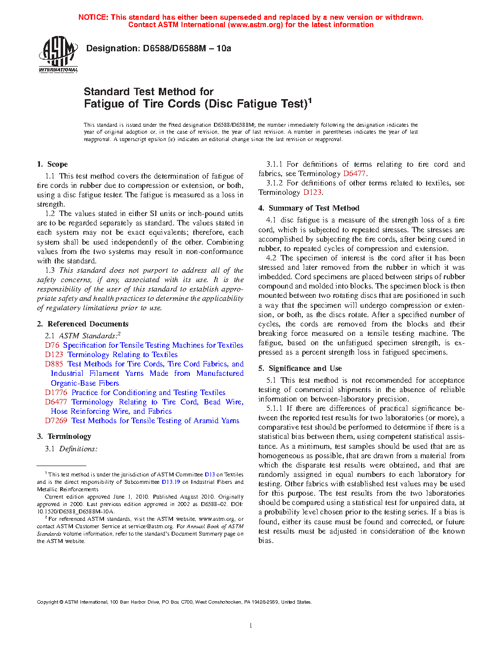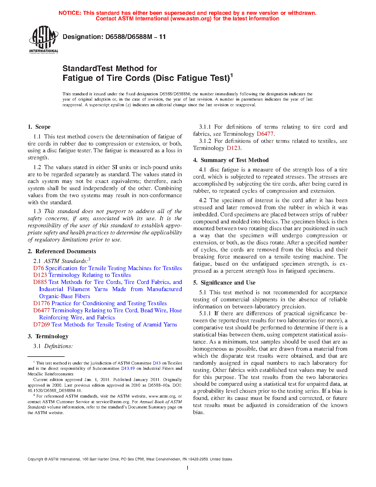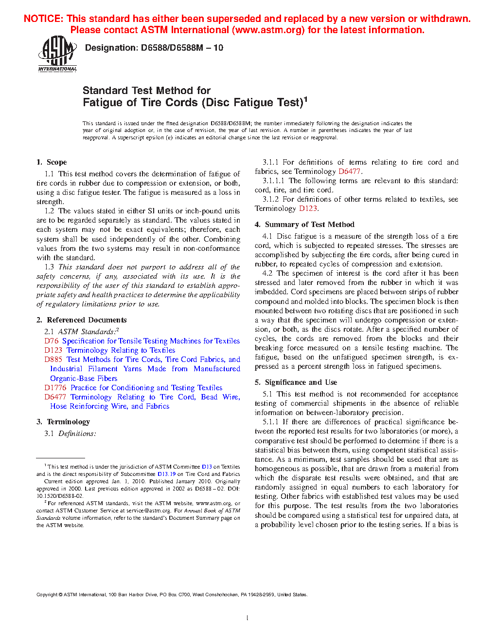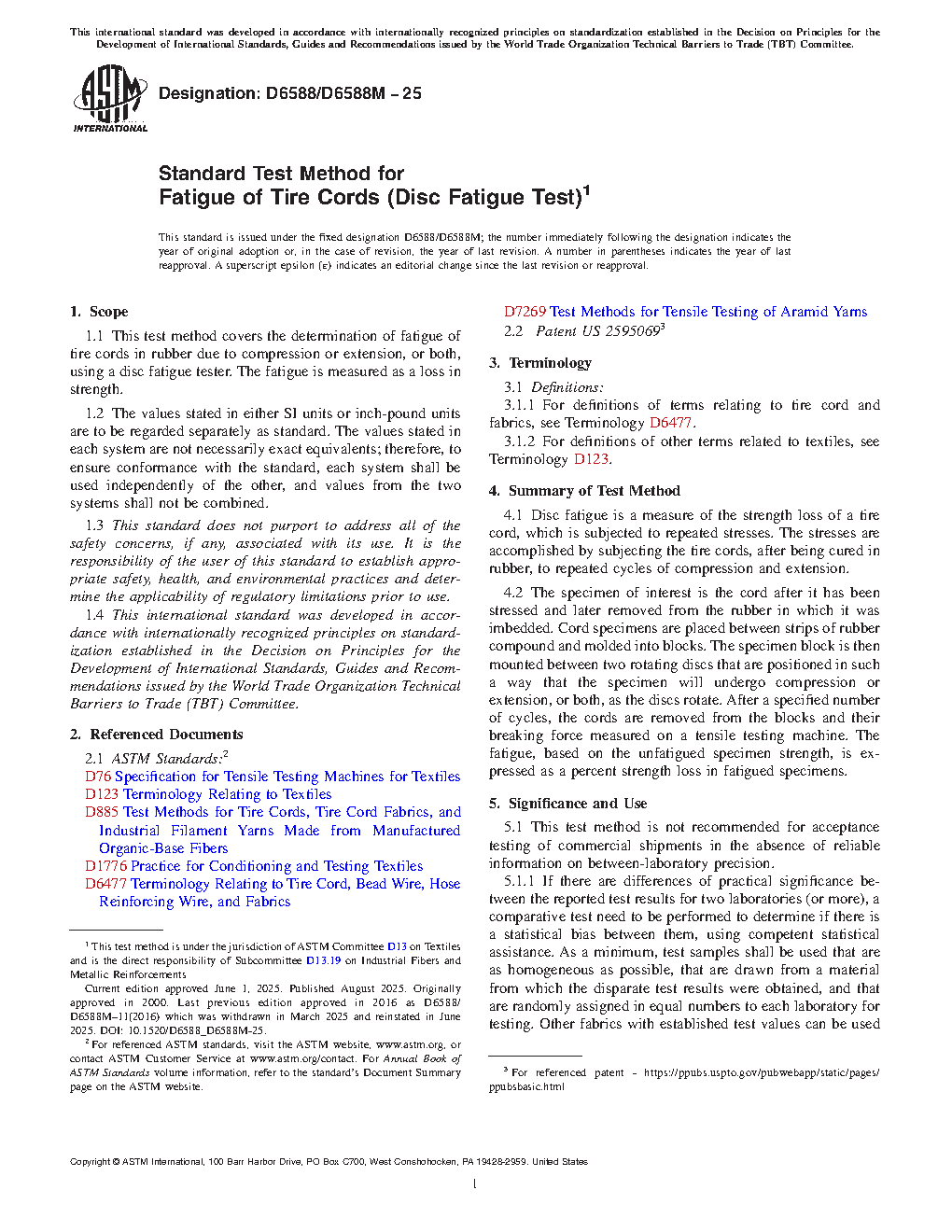 1.1 This test method covers the determination of fatigue of tire cords in rubber due to compression or extension, or both, using a disc fatigue tester. The fatigue is measured as a loss in strength.