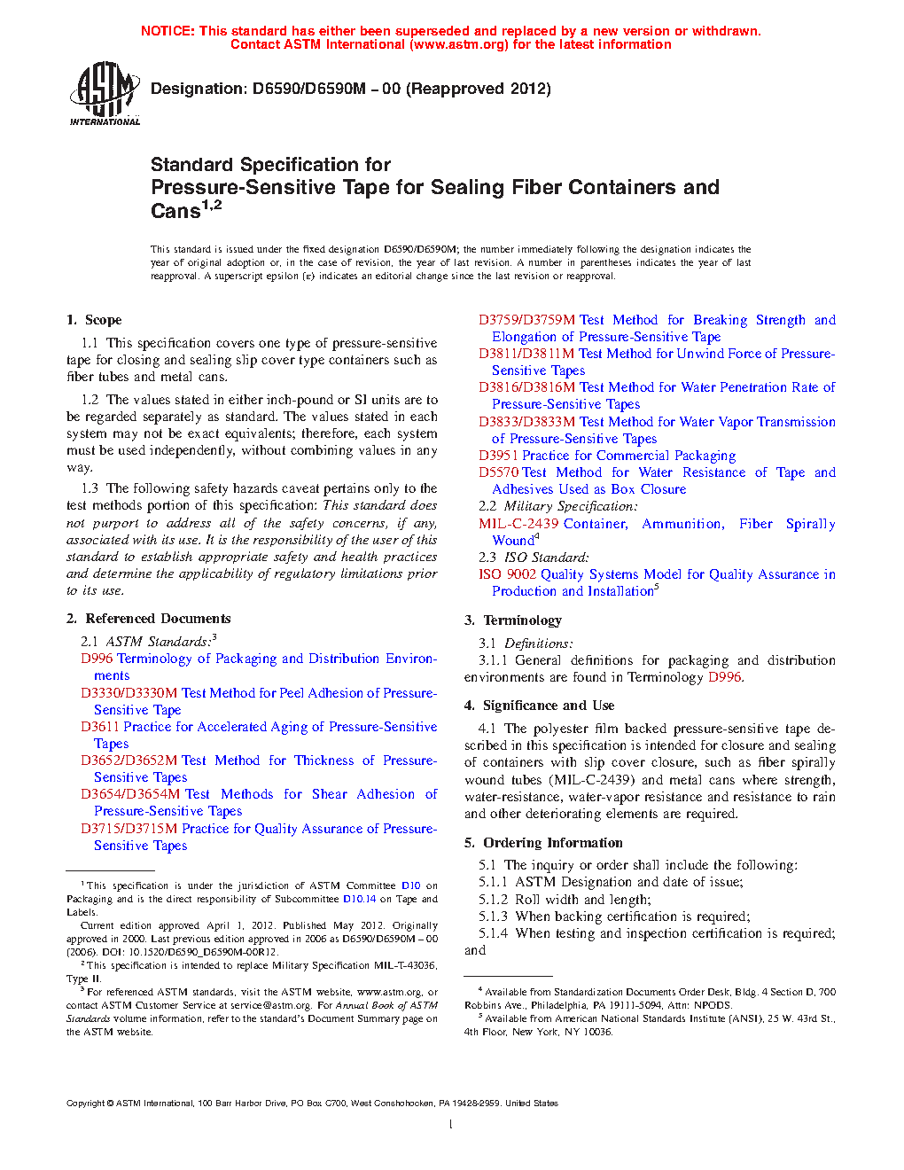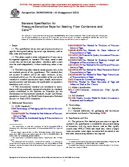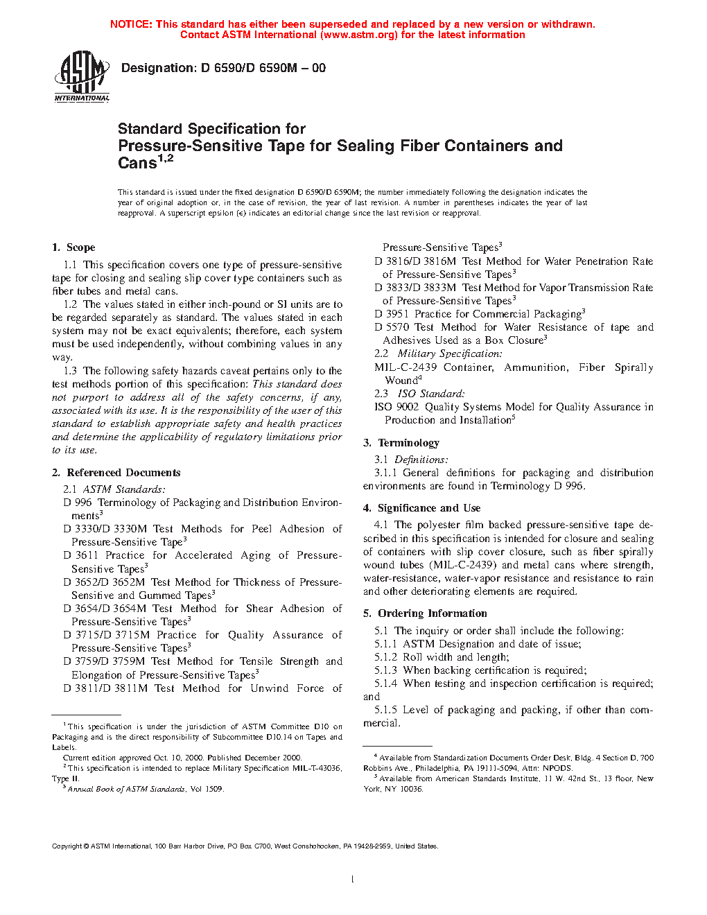 1.1 This specification covers one type of pressure-sensitive tape for closing and sealing slip cover type containers such as fiber tubes and metal cans.