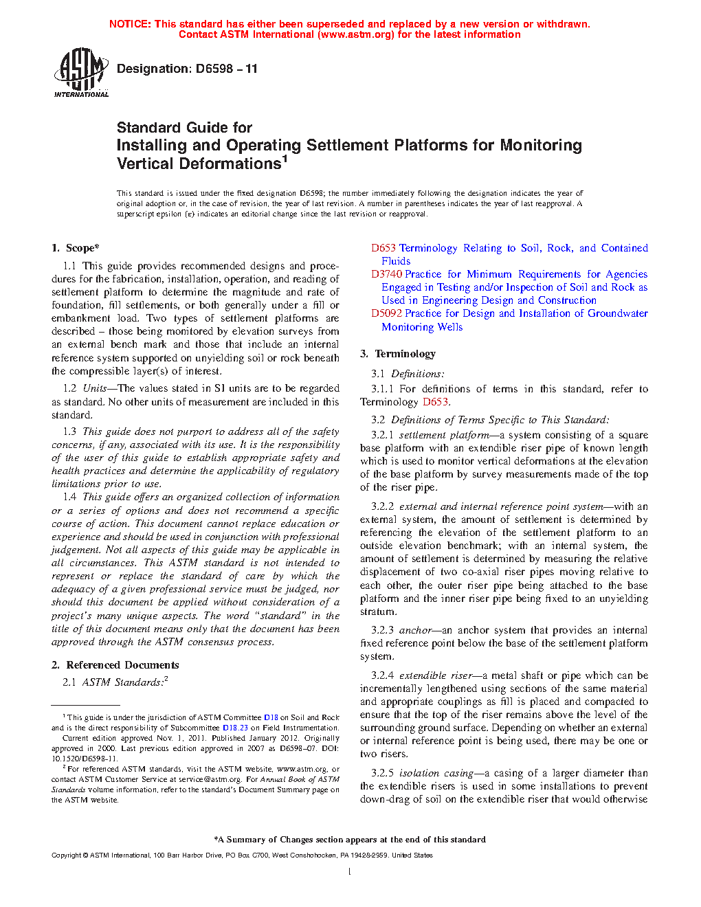 1.1 This guide provides recommended designs and procedures for the fabrication, installation, operation, and reading of settlement point(s) to determine the magnitude and rate of foundation, fill settlements, or both generally under a fill or embankment load. Two types of settlement points are described – those being monitored by elevation surveys from an external bench mark and those that include an internal reference system supported on unyielding soil or rock beneath the compressible layer(s) of interest.