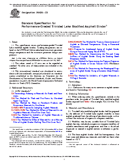1.1 This specification covers performance graded Trinidad Lake modified asphalt binders. Grading designations are related to the average seven-day maximum pavement design temperature, °C, the intermediate pavement design temperature, °C, and minimum pavement design temperature, °C.