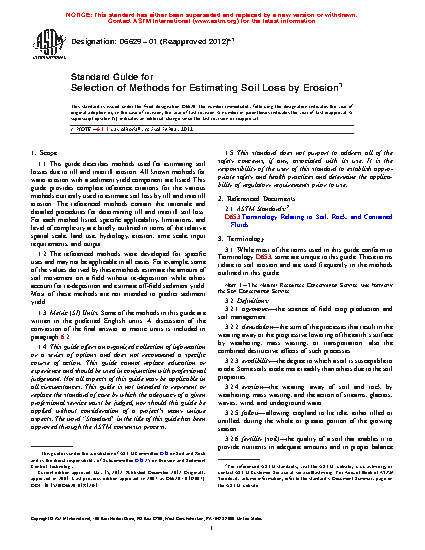 1.2 The referenced methods were developed for specific uses and may not be applicable in all cases. For example, some of the values derived by these methods estimate the amount of soil movement on a field without re-deposition while others account for re-deposition and estimate off-field sediment yield. Most of these methods are not intended to predict sediment yield.