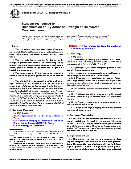 5.1 This method is an index test and measures the force required to separate individual plies of a reinforced geomembrane. The acceptable value of adhesion will vary for different types of products. However, for a particular type of product, minimum values of ply adhesion can be determined and agreed to by producer and consumer, and both can monitor to ensure compliance with the agreed-upon value.