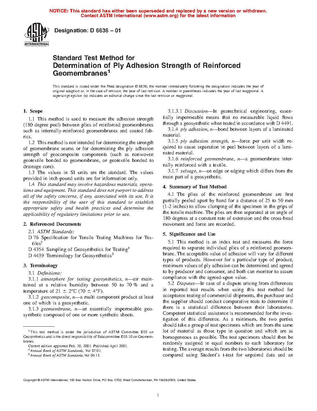 1.2 This test method is not intended for determining the strength of geomembrane seams or for determining the ply adhesion strength of geocomposite components (such as nonwoven geotextile bonded to geomembrane, or geotextile bonded to drainage core).