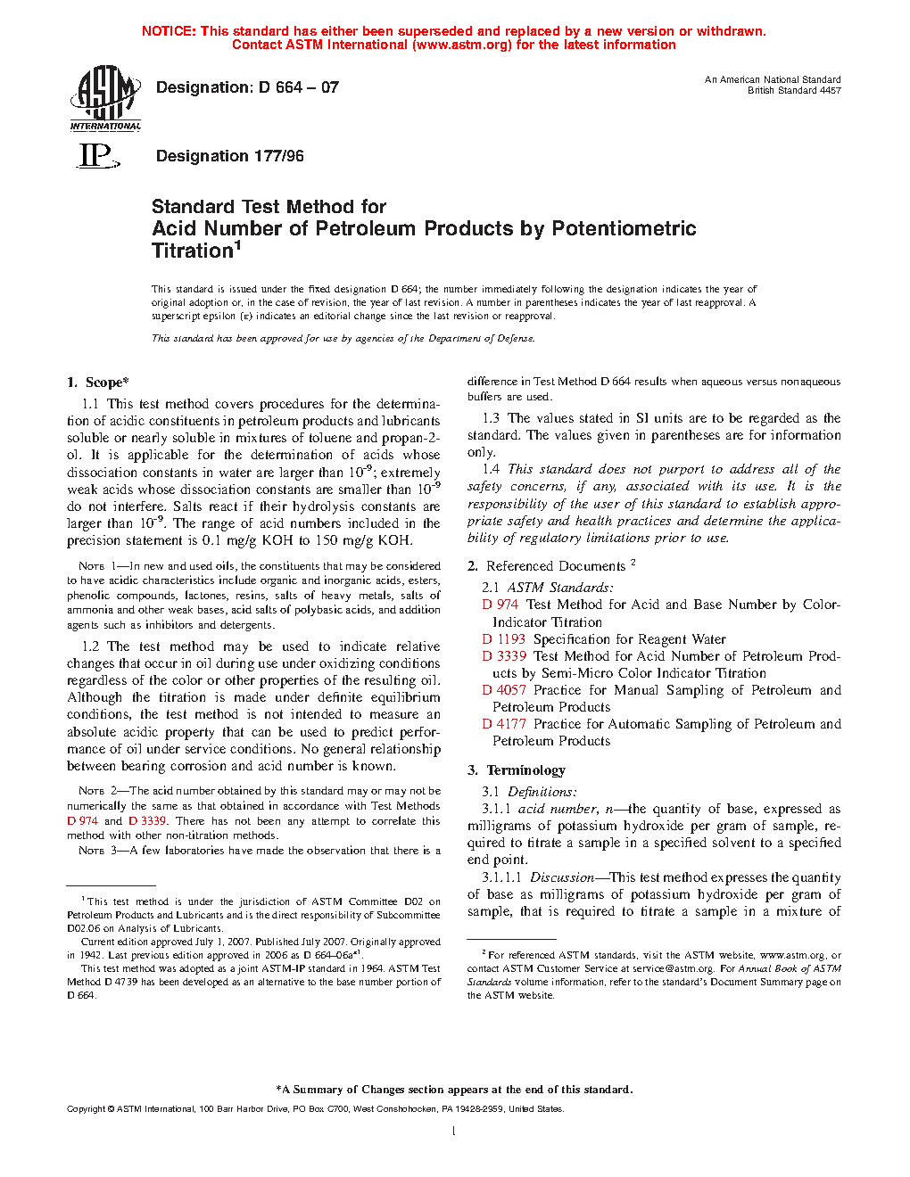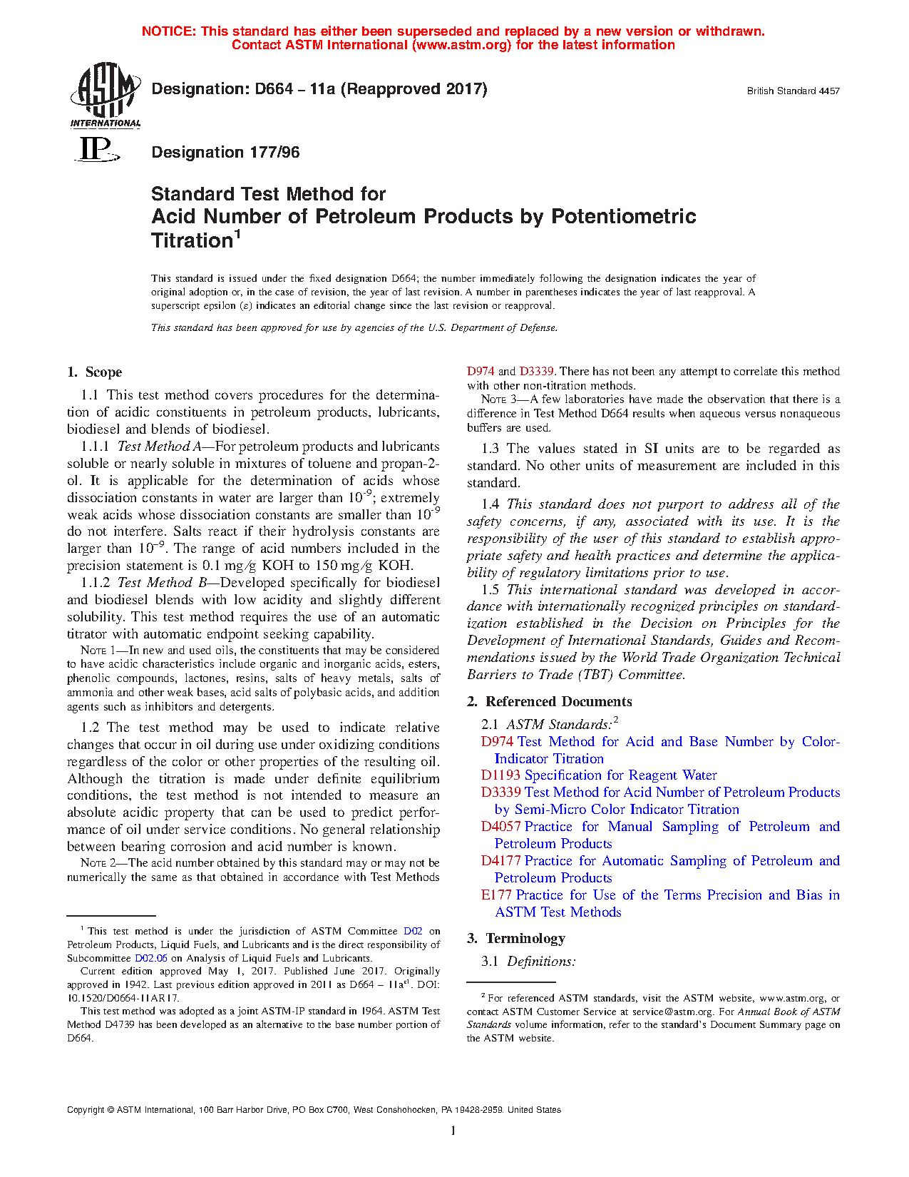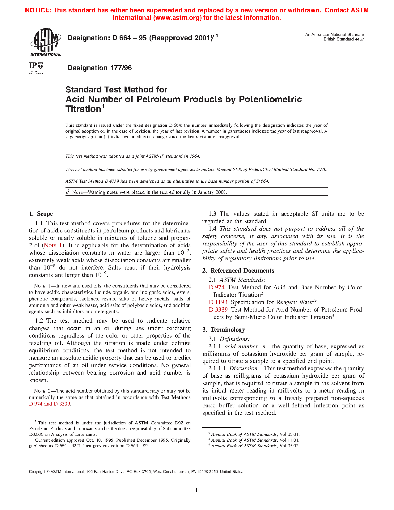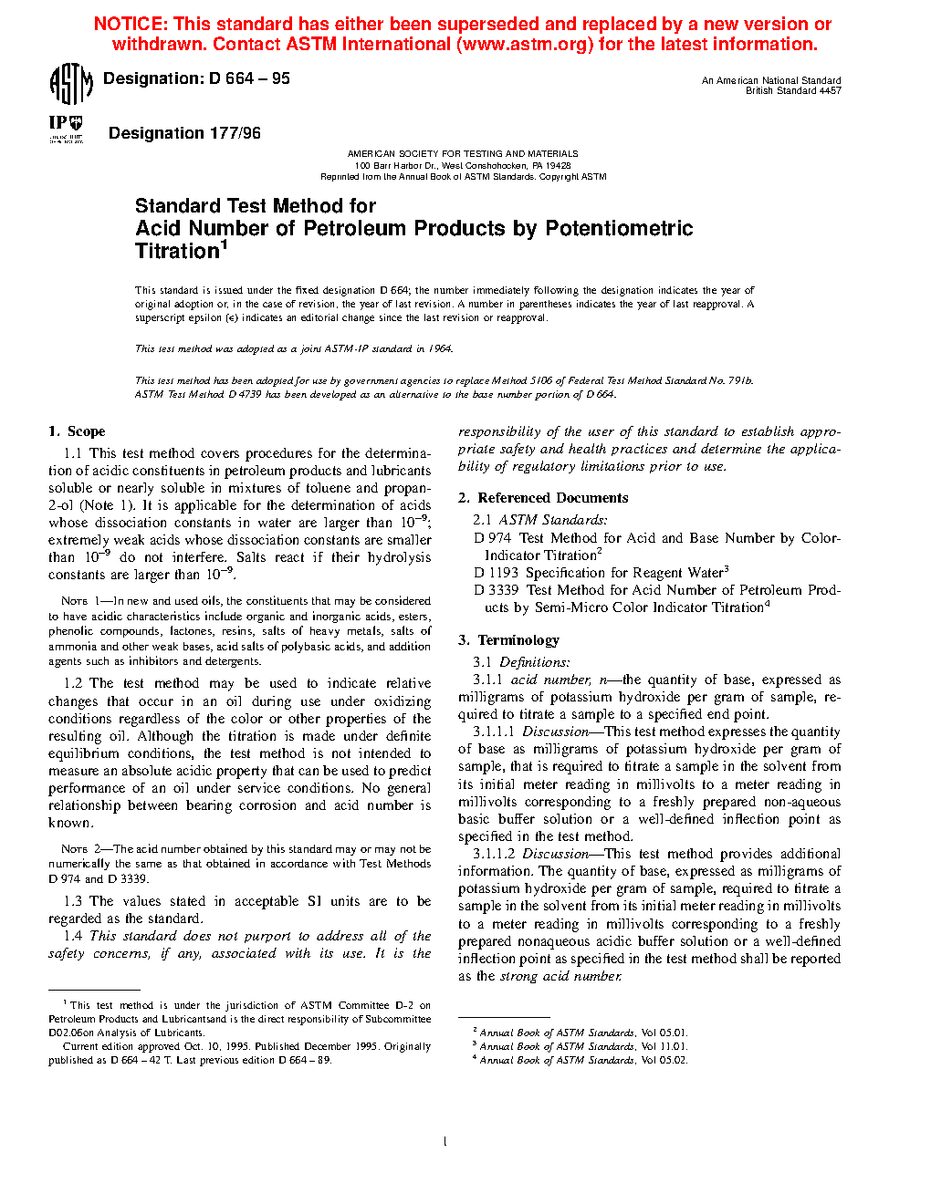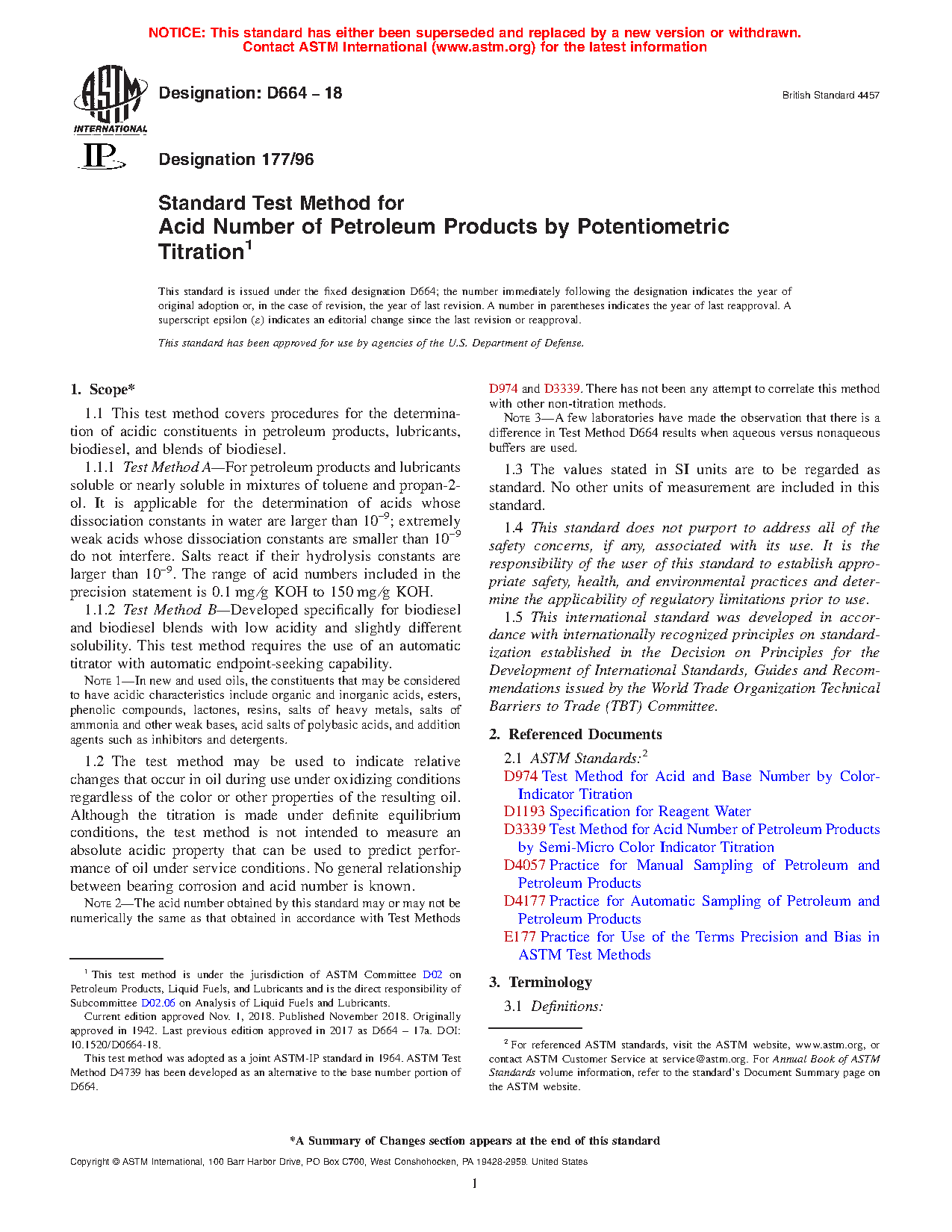 Note 2The acid number obtained by this standard may or may not be numerically the same as that obtained in accordance with Test Methods D 974 and D 3339. There has not been any attempt to correlate this method with other non-titration methods.