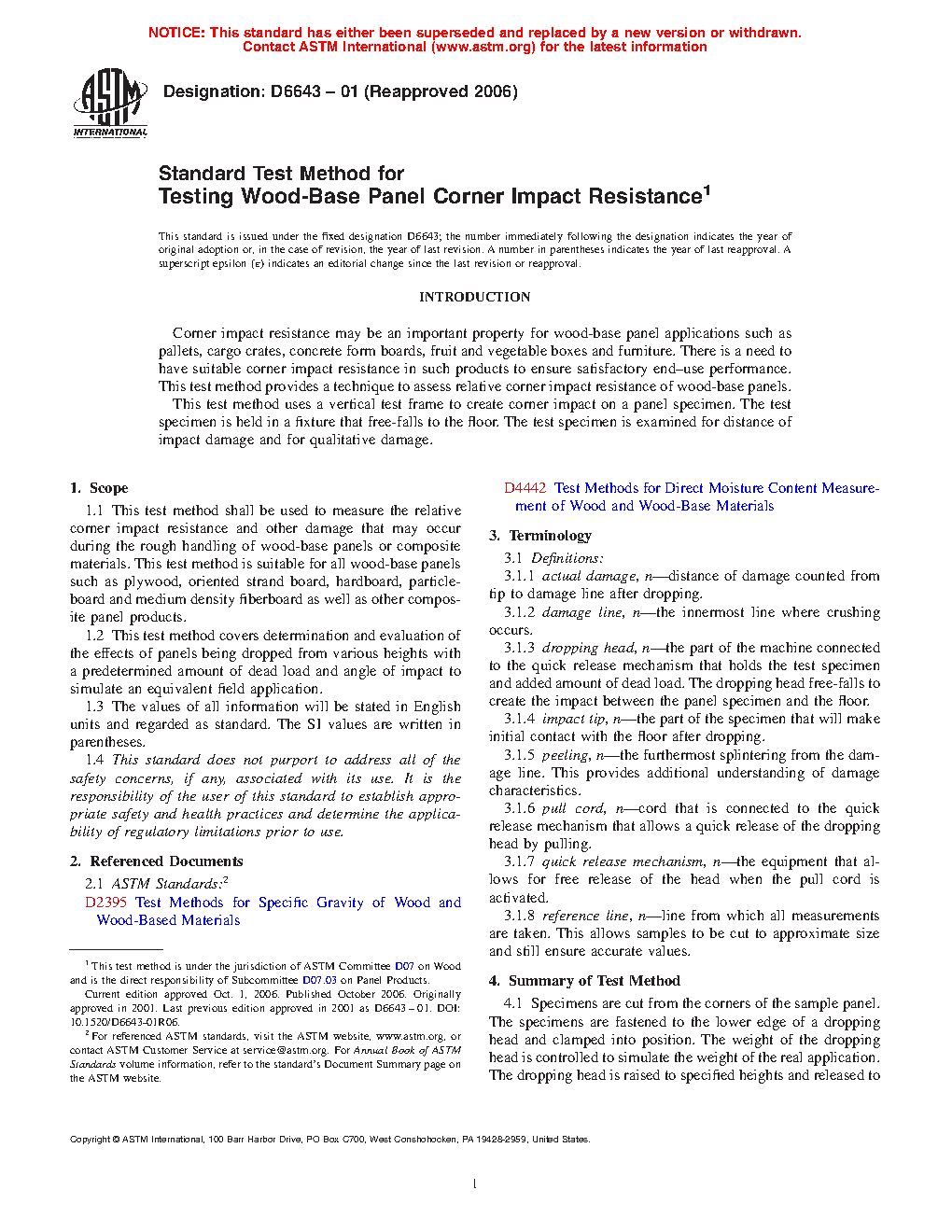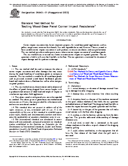 1.1 This test method shall be used to measure the relative corner impact resistance and other damage that may occur during the rough handling of wood-base panels or composite materials. This test method is suitable for all wood-base panels such as plywood, oriented strand board, hardboard, particleboard and medium density fiberboard as well as other composite panel products.