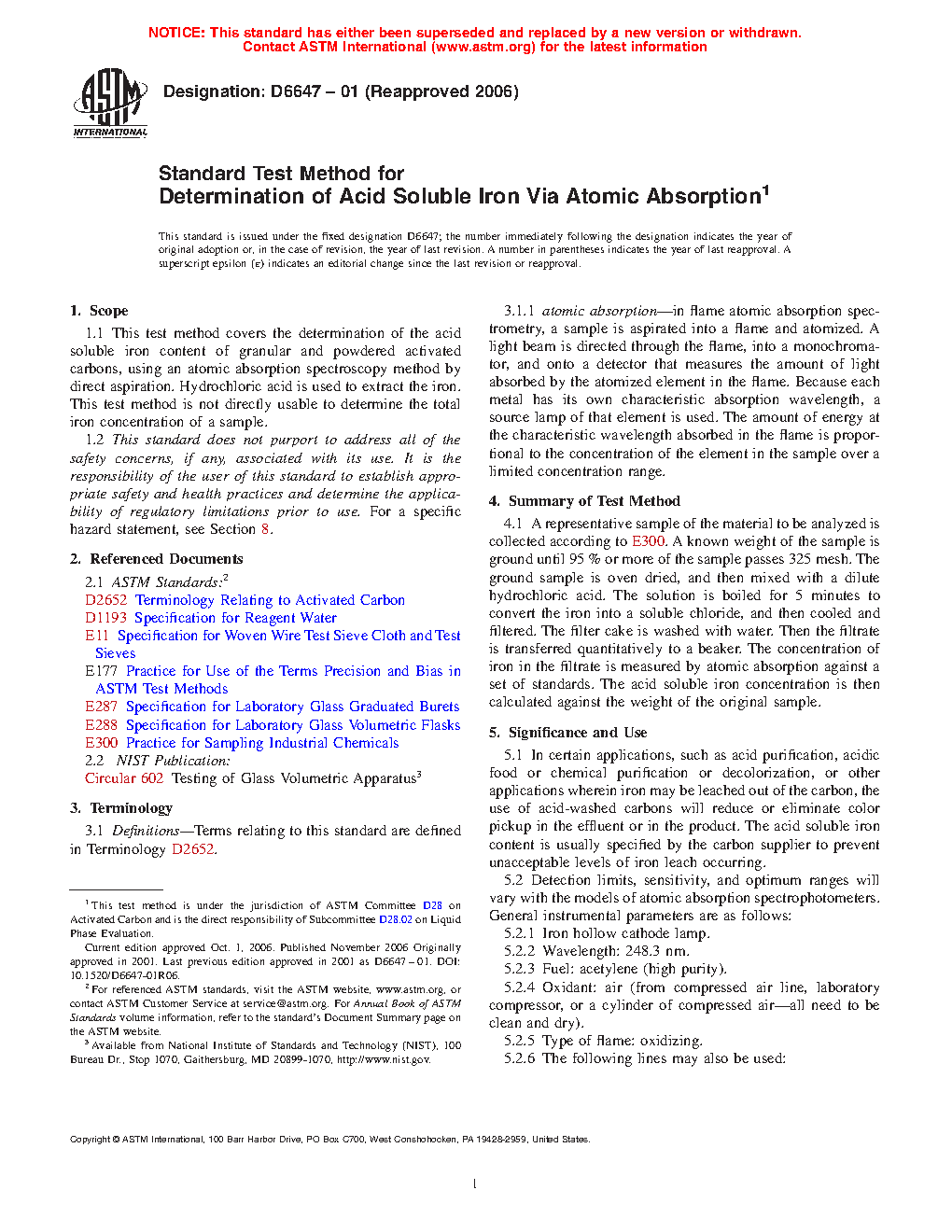 1.1 This test method covers the determination of the acid soluble iron content of granular and powdered activated carbons, using an atomic absorption spectroscopy method by direct aspiration. Hydrochloric acid is used to extract the iron. This test method is not directly usable to determine the total iron concentration of a sample.