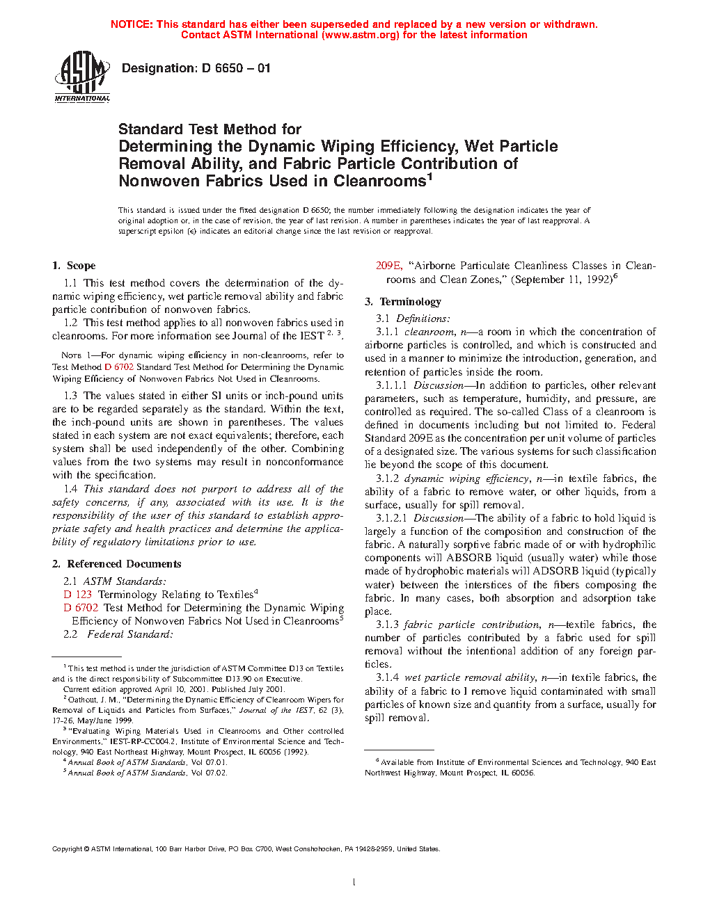 Note 1For dynamic wiping efficiency in non-cleanrooms, refer to Test Method D 6702 Standard Test Method for Determining the Dynamic Wiping Efficiency of Nonwoven Fabrics Not Used in Cleanrooms.